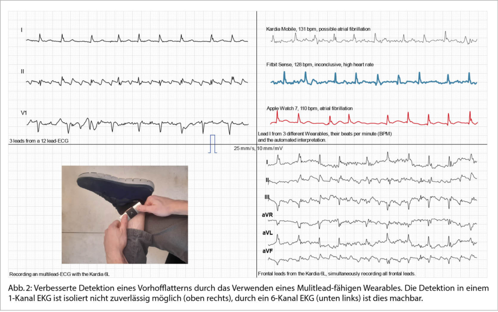 Die Detektion von Vorhofflattern (VHFlat) stellt für Wearables im Bereich der Aufzeichnungsmöglichkeiten keine Schwierigkeit dar, wohl aber im Bereich der Interpretation durch den Algorithmus. Smartwatches zeichnen bei herkömmlicher Nutzung ein 1-Kanal-EKG auf, welches der Ableitung I des konventionellen EKGs entspricht. (Abb. 2). Ein Lösungsansatz bietet eine einfache Anpassung der Tragweise der Uhr: Durch eine Platzierung dieser am linken Knöchel kann ein Derivat der Ableitung II aufgezeichnet werden, welche von der Morphologie derjenigen einer herkömmlichen Einthoven II Ableitung näher kommt (11).