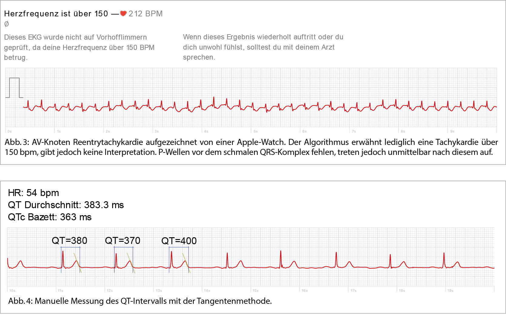Die QT-Zeiten müssen für alle Wearables bis auf die Withings Scanwatch allerdings manuell ausgemessen werden. (Abb. 4) Die manuelle Erfassung bietet ein hohes Fehlerpotential und kann je nach erfassender Person und deren Erfahrung substantiell variieren (22). Zudem ist zu beachten, dass ein 1-Kanal-EKG nicht die QT-Dispersion eines 12-Kanal EKG erfassen kann, möglicherweise also die QTc Zeit über- oder unterschätzt. Aktuell besitzt das Kardia 6L als Multilead-Device als einziges Handheld Device eine FDA-Zulassung zur Messung des QT-intervals. Die Autoren stehen dem Einsatz der Wearables für diese Indikation aufgrund der aktuellen Datenlage allerdings noch zurückhaltend gegenüber.