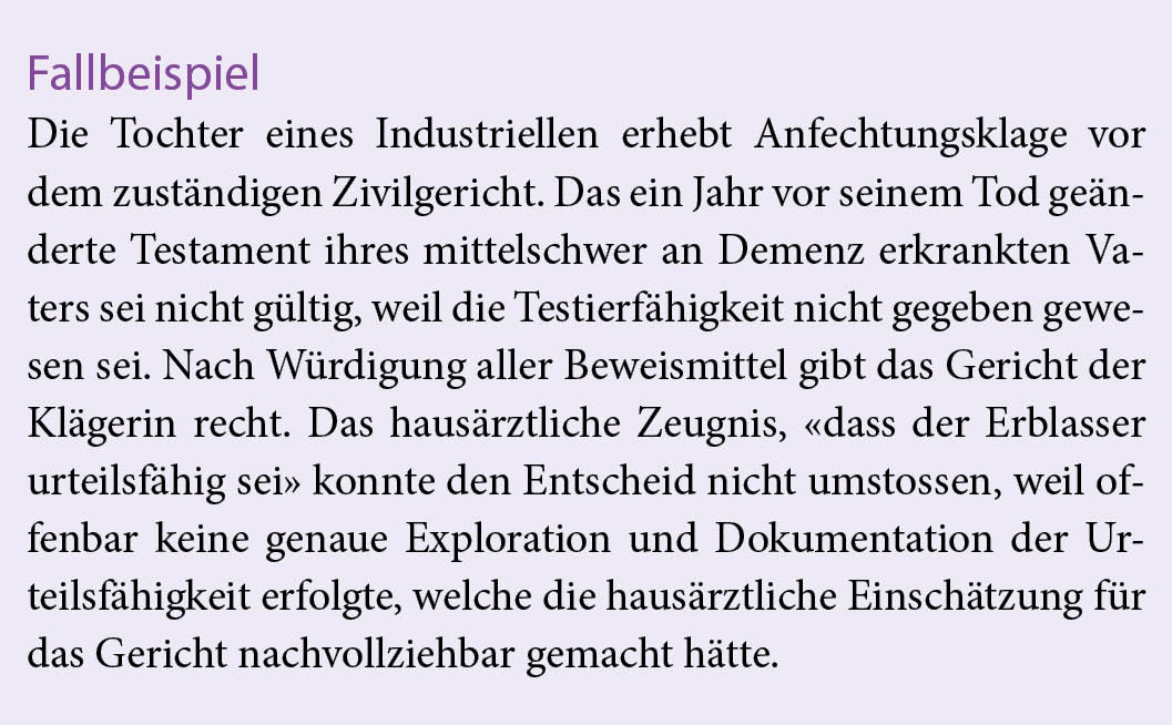 Wer urteilsfähig und volljährig ist, kann über sein Vermögen letztwillig verfügen und ist testierfähig. Dies gilt grundsätzlich auch für Menschen mit kognitiven Einschränkungen, wie sie bei einer dementiellen Erkrankung vorliegen. Oft ist der Hausarzt die erste Ansprechperson, wenn es um die Überprüfung der Testierfähigkeit geht. Die Abklärung kann allerdings sehr anspruchsvoll sein und in schwierigen Familiensituationen sind Anfechtungsklagen der Erben nicht selten. Ein strukturiertes und gut dokumentiertes Vorgehen zur Beurteilung der Testierfähigkeit ist deshalb wichtig.