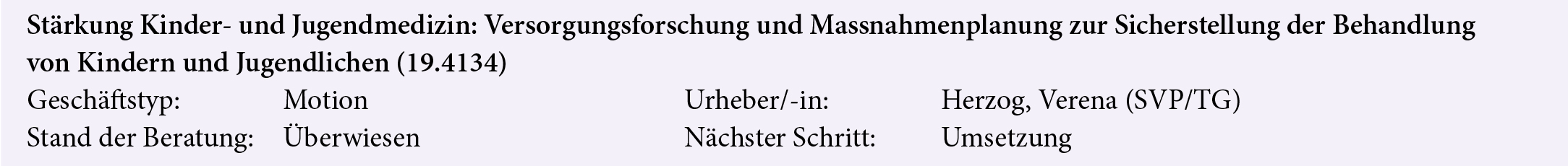 Der Bund soll periodisch eine spezifische Versorgungsforschung im Bereich der Kinder- und Jugendmedizin in Auftrag geben, wobei der volkswirtschaftliche Nutzen der Kinder- und Jugendmedizin zu evaluieren sei. Nach dem Nationalrat in der Herbstsession 2021 nahm nun auch der Ständerat die Motion an. Der Bundesrat ist beauftragt, das Anliegen umzusetzen.