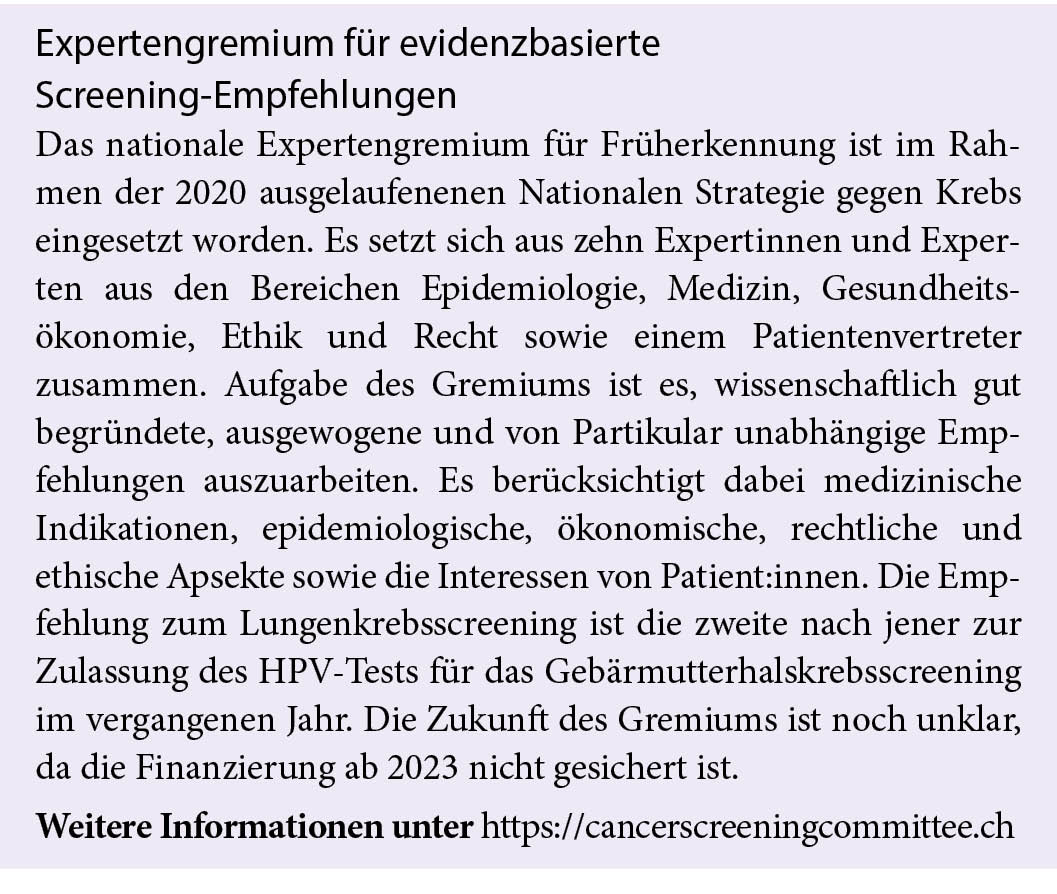 Das unabhängige Expertengremium Früherkennung hat sich der Frage angenommen, ob auch in der Schweiz ein Lungenkrebsscreening eingeführt werden soll. Zehn unabhängige Expertinnen und Experten aus unterschiedlichen Fachrichtungen haben die ethischen Fragen des Lungenkrebsscreenings, dessen klinische Wirksamkeit sowie Kosteneffektivität und Budget Impact beurteilt und im vergangenen November eine evidenzbasierte Empfehlung für die Schweiz abgegeben. Sie schlagen vor, für Risikogruppen ein Screening mittels niedrigdosierter Computertomographie anzubieten.