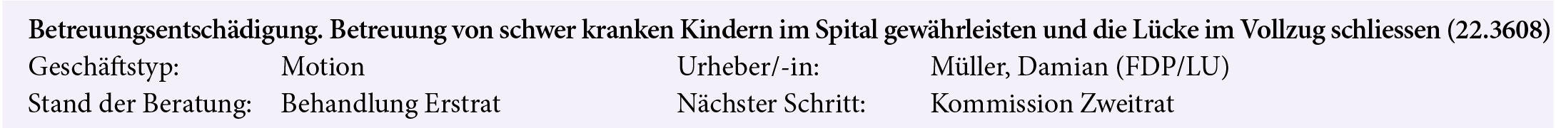 Seit dem 1. Juli 2021 können erwerbstätige Eltern von Kindern mit schweren gesundheitlichen Beeinträchtigungen einen Betreuungsurlaub beziehen. Seither zeigt sich, dass das Gesetz die vorgesehene Entlastung von Eltern und Arbeitgebern vielfach nicht gewährleistet und die Bestimmung ihr ursprüngliches Ziel damit nur zu einem kleinen Teil erreicht. Viele Familien fallen durch die Maschen des Gesetzes. Die derzeit gültigen Kriterien für einen Betreuungsurlaub sind realitätsfern, da schwer kranke Kinder mit guter Prognose (etwa nach schweren Operationen) oder mit vorgeburtlichen Erkrankungen sie kaum erfüllen können. Doch auch diese Kinder brauchen ihre Eltern im Spital.