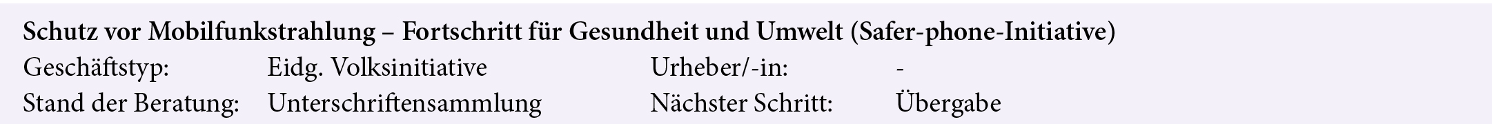 Mit der Volksinitiative soll die Bundesverfassung dahingehend angepasst werden, dass der Bund Vorschriften über den Schutz vor nichtionisierender Strahlung erlässt. In diesem Zusammenhang ist im Parlament noch die Motion 20.3237 (Mobilfunknetz – Rahmenbedingungen für einen raschen Aufbau jetzt schaffen) hängig. Die KVF-S hat bei der Verwaltung Abklärung verlangt zu den Messverfahren bezüglich Immissionsgrenzwerte. Ausserdem hat sie die Verwaltung beauftragt, den Bericht zum Monitoring der nichtionisierenden Strahlung vom Juni 2022 in Bezug auf Orte, an denen sich regelmässig besonders schutzbedürftige Personen aufhalten, zu ergänzen.