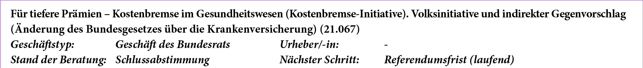 Aktueller Stand: Die Volksinitiative «Für tiefere Prämien – Kostenbremse im Gesundheitswesen (Kostenbremse-Initiative)» verlangt die Einführung einer Kostenbremse in der obligatorischen Krankenpflegeversicherung (OKP). Der Bundesrat anerkennt das Anliegen der Kostendämpfung, lehnt die Initiative aber ab, weil die verlangte ausschliessliche Koppelung der Massnahmen an die Wirtschafts- und Lohnentwicklung zu kurz greift. Er stellt der Initiative einen indirekten Gegenvorschlag gegenüber: Der Bundesrat und die Kantone sollen ausgehend vom medizinischen Bedarf einen Prozentsatz für den maximalen Anstieg der Kosten der OKP im Vergleich zum Vorjahr festlegen (Kostenziel). Werden die Kostenziele nicht eingehalten, prüfen die Kantone und der Bundesrat, ob Massnahmen zur Korrektur von Fehlentwicklungen notwendig sind. Das bestehende Instrumentarium dafür wird gezielt ergänzt. Der Ständerat und der Nationalrat bereinigten die Differenzen in der Herbstsession 2023. In der Schlussabstimmung wurde das Bundesgesetz über die Krankenversicherung (Massnahmen zur Kostendämpfung – Vorgabe von Kosten- und Qualitätszielen) vom Nationalrat einstimmig mit 163 Stimmen bei 33 Enthaltungen und vom Ständerat mit 39 zu 1 Stimmen bei 4 Enthaltungen angenommen. Der Bundesbeschluss über die Volksinitiative “für tiefere Prämien – Kostenbremse im Gesundheitswesen (Kostenbremse-Initiative)” wurde vom Nationalrat mit 110 zu 31 Stimmen bei 55 Enthaltungen und vom Ständerat mit 39 zu 1 Stimme bei 1 Enthaltung angenommen. Die Bundesversammlung empfiehlt Volk und Ständen, die Initiative abzulehnen.