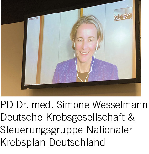 Als einleitendes Inputreferat stellte Simone Wesselmann von der Deutschen Krebsgesellschaft (DKG) kurz den Nationalen Krebsplan in Deutschland vor. Als einen der Kernpunkte ihres Vortrags hob sie die Bedeutung des Engagements des Bundesministeriums für Gesundheit hervor. Die Möglichkeit, Gesetze zu entwickeln und zu verabschieden, sei zentral für die effiziente Umsetzung des Deutschen Krebsplans. Als weiteren wichtigen Punkt nannte sie die Möglichkeit, sichtbare Ergebnisse aus den Projektaktivitäten präsentieren zu können.
