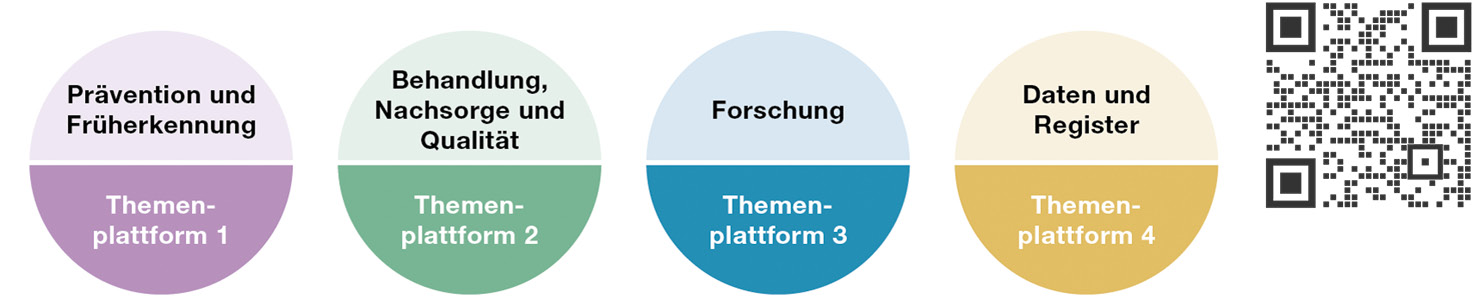 Unter Berücksichtigung dieser Rahmenbedingungen sollen nach Ansicht aller Beteiligten die Krebsorganisationen die thematischen Inhalte eines Nationalen Krebsplans definieren. Oncosuisse hat hier mit den Themenplattformen unter Einbindung der Akteur:innen der Krebsversorgung bereits grosse Vorarbeit geleistet und wird im Sommer 2024 im «Masterplan 2030» Vorschläge für thematische Schwerpunkte veröffentlichen (www.oncosuisse.ch).