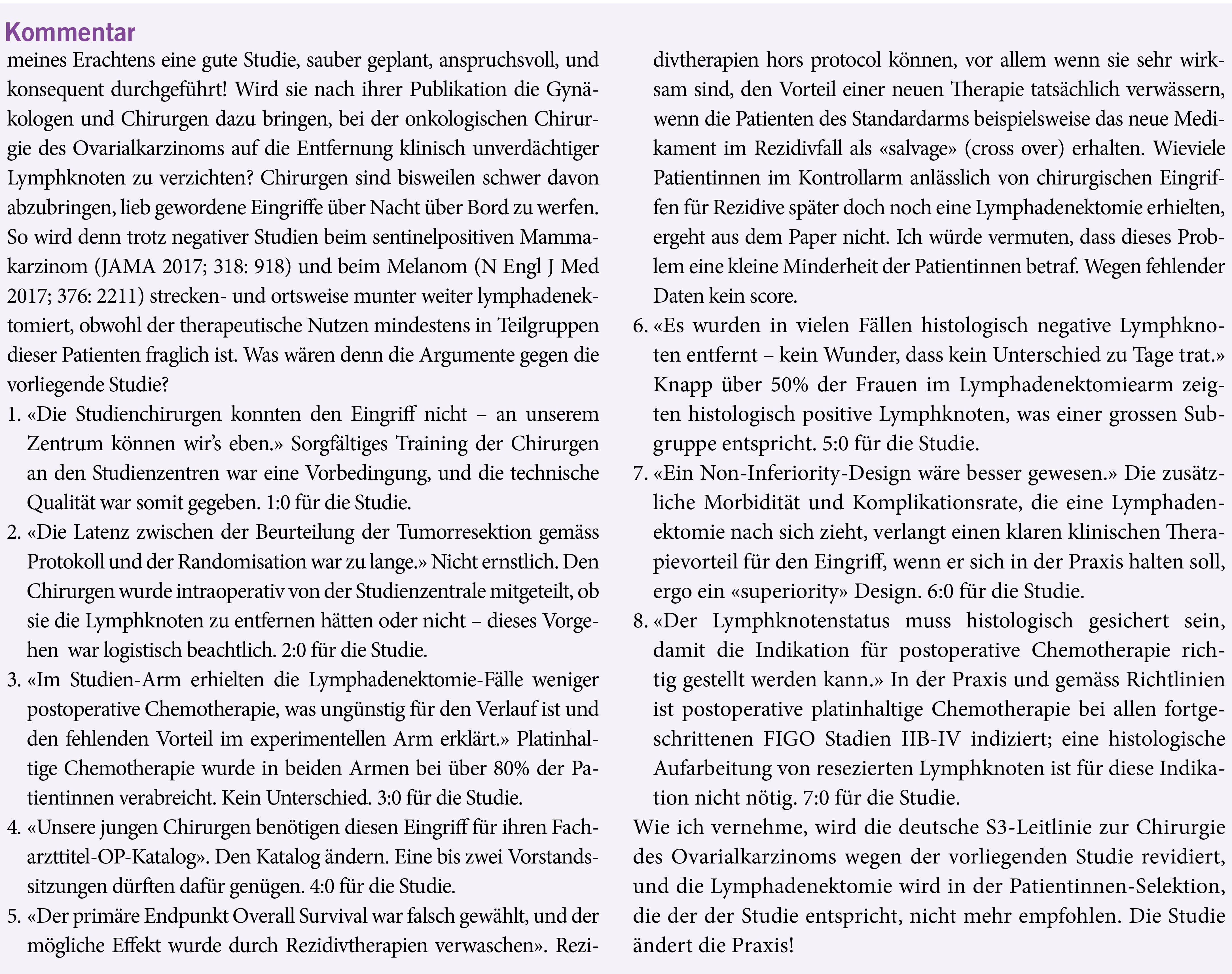 Zusammenfassung: anlässlich der chirurgischen Resektion eines Primärtumors wird routinemässig oft eine regionäre Lymphadenektomie vorgenommen, so beim Mammakarzinom, beim Melanom, beim Ovarialkarzinom und bei anderen Neoplasien. Unbestreitbar ergibt dieser bisweilen langwierige und manchmal komplikationsträchtige Zusatzeingriff postoperativ ein genaueres Tumorstadium dank der histologischen Aufarbeitung der Lymphknoten. Ob jedoch eine Lymphadenektomie per se einen therapeutischen Wert hat, ist in vielen Fällen, so auch beim Ovarialkarzinom, unklar. Nun legt eine deutsche klinische Studiengruppe eine randomisierte Studie zu dieser Frage vor bei Frauen mit Stadium IIB-IV Ovarialkarzinom. War die makroskopisch radikale Resektion aller Tumorherde erfolgt, und schien der Nodalstatus intraoperativ makroskopisch negativ, so legte man intraoperativ per Randomisation fest, ob die regionären Lymphknoten entfernt werden sollten oder nicht. Die Studie war im «superiority design» geplant – die Lymphadenektomie hätte zu einem höheren 3-Jahres-Überleben (HR 0.7) führen sollen. Der Eingriff hatte keinen Einfluss auf progressionsfreies und Gesamtüberleben (HR 1.06), führte aber zu mehr Komplikationen.