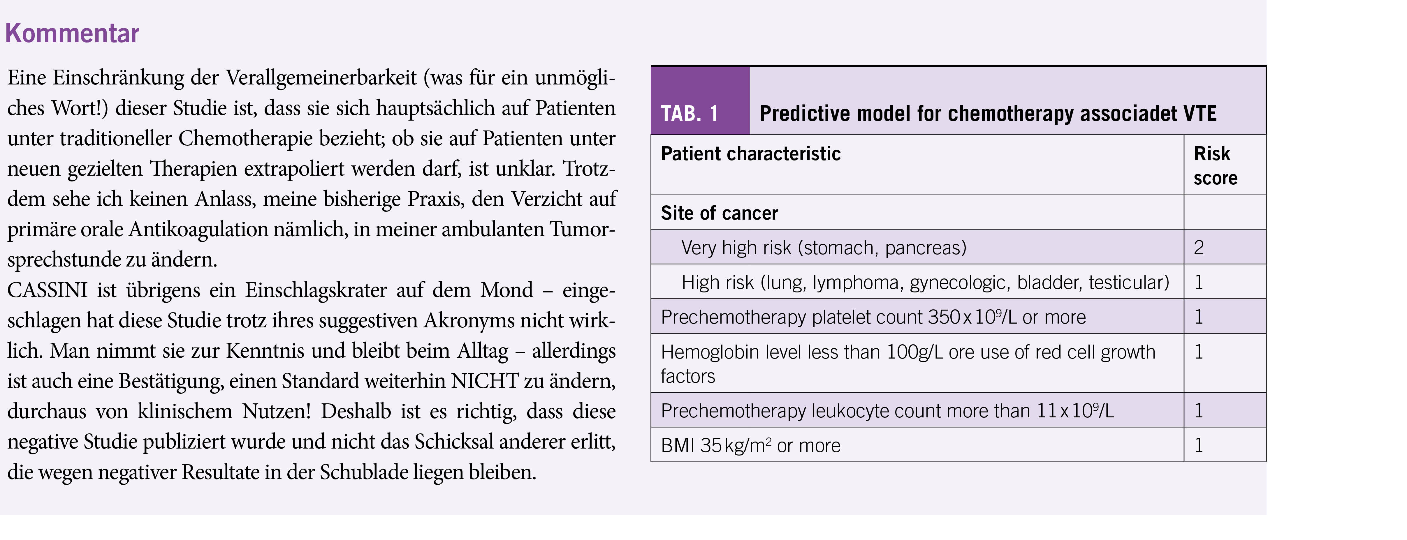 Auch ambulante Patienten mit diversen Tumoren mögen ein erhöhtes Thrombo-Embolie-Risiko haben; eine flächendeckende primäre prophylaktische Antikoagulation hat sich bisher nicht eingebürgert. Die sog. CASSINI-Studie ist demnach von praktischem Interesse, indem sie in einer ambulanten Hochrisiko-Population von Tumorpatienten ohne Nachweis einer erfolgten Thromboembolie den Nutzen einer prophylaktischen oralen Antikoagulation mit 10 mg Rivaroxaban täglich über 180 Tage im Vergleich zu einer Placebo-Kontrolle getestet hat. Der verwendete Khorana Risiko-Score für Thromboembolien bei Tumorpatienten ist wohl kaum allgemein gebräuchlich – er muss aus dem Supplement-Material und aus dem Referenzpapier ausgegraben werden. Da sich jedoch kein Vorteil zu Gunsten einer Antikoagulation für ambulante Patienten ergab, nicht einmal für die selektionierte Hochrisiko-Gruppe, ist die Kenntnis des Khorana-Score in der Praxis entbehrlich (Tab 1).