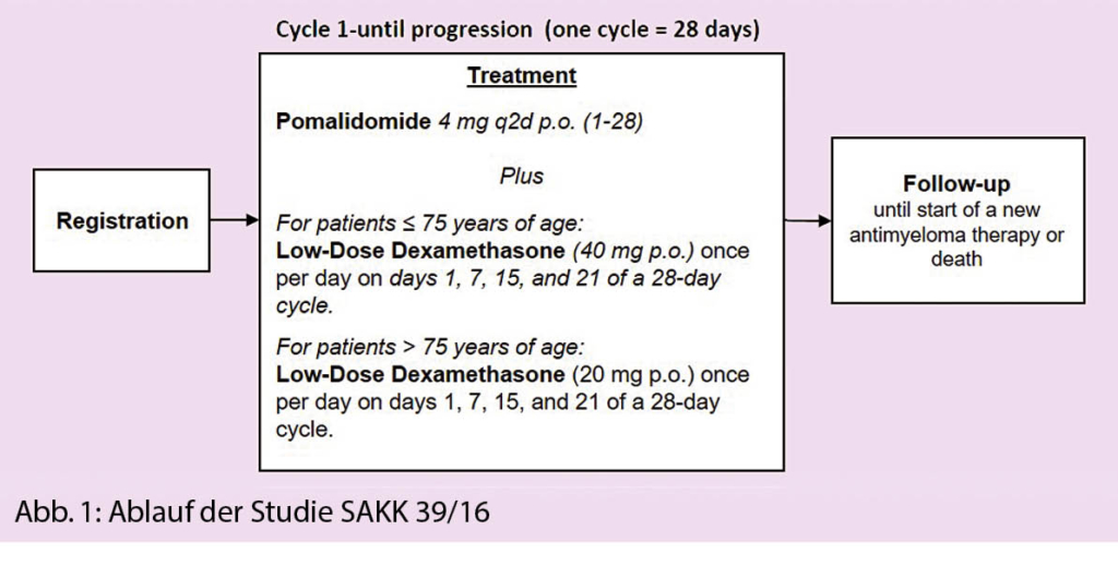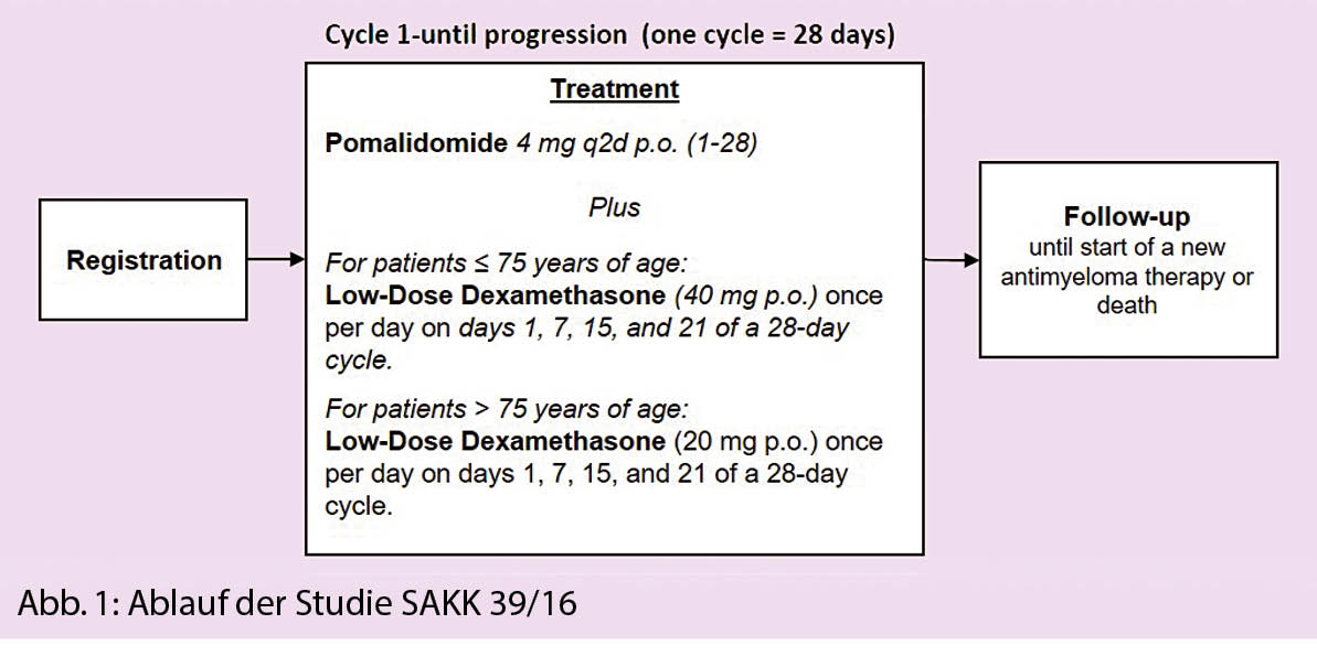 Pomalidomid ist sehr wirksam und hat von allen bislang zugelassenen IMiDs die längste Halbwertszeit. Deshalb wird in der Studie SAKK 39/16 ein alternatives Dosierungsschema geprüft. Die Patienten erhalten innerhalb eines 28-Tage-Zyklus jeden zweiten Tag 4 mg Pomalidomid (Schema: 4 mg q 2d, d1-28) und nicht mehr täglich. Wegen der niedrigeren Dosierung wird auf die bislang notwendige Pause von einer Woche verzichtet. Dadurch wird eine gleichmässigere Verteilung erreicht. Ergänzend wird wöchentlich Dexamethason in altersadaptierter Dosierung verabreicht. Diese Behandlung wird bis zum Fortschreiten der Erkrankung oder bis zur Unverträglichkeit fortgeführt. Der primäre Endpunkt der Studie ist die Ansprechrate im Vergleich zur Zulassungsstudie. Zu den sekundären Endpunkten gehören das Gesamtüberleben, das progressionsfreie Überleben und das Auftreten von Nebenwirkungen. Zur wissenschaftlich belastbaren Auswertung der Studie sollen 110 Patientinnen und Patienten teilnehmen, die in 15 Zentren in der Schweiz behandelt werden.