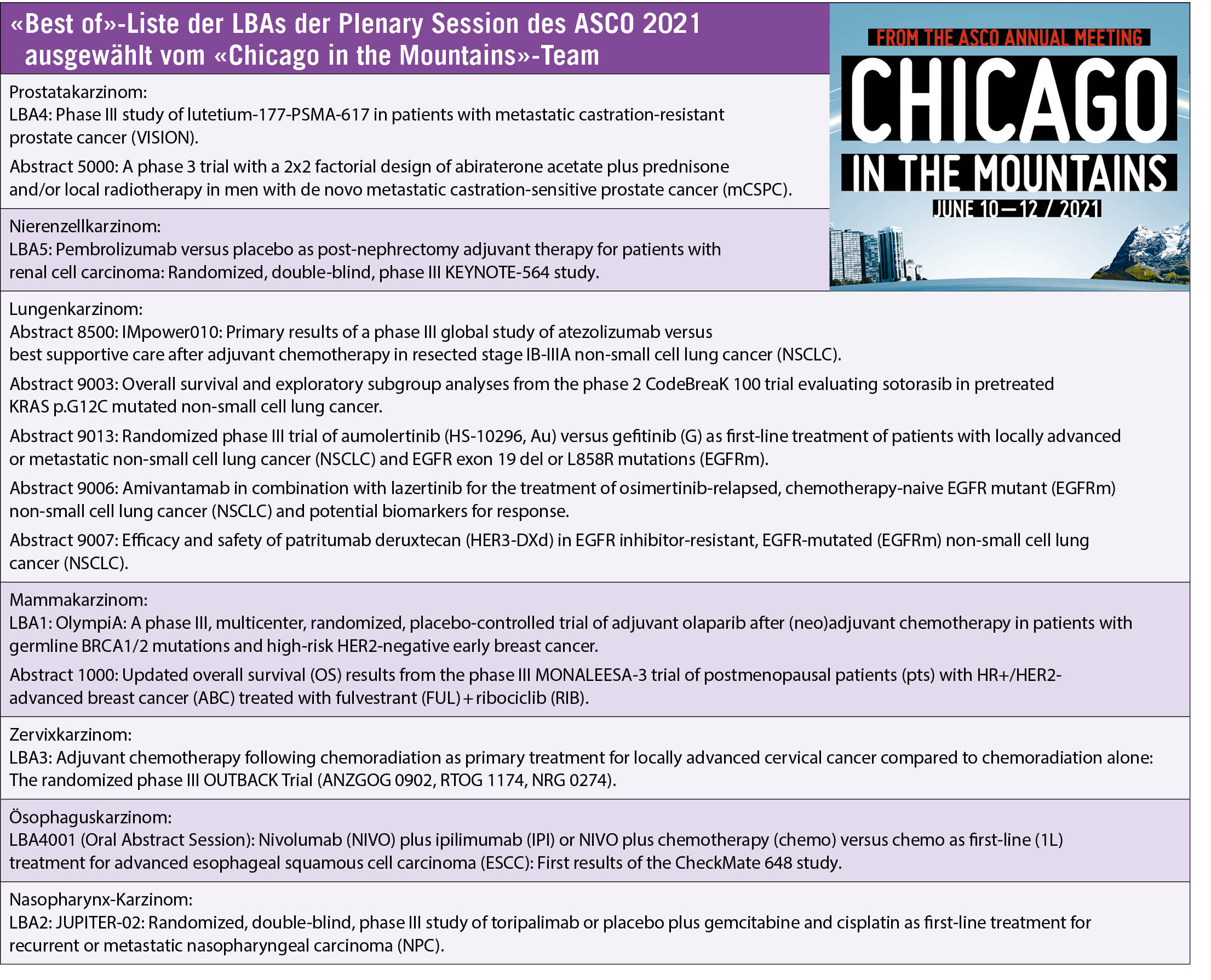 Hier also die LBAs der Plenary Session des ASCO 2021und die Hitliste des Teams «Chicago in the Mountains», wobei die LBAs auch Teil davon sind: