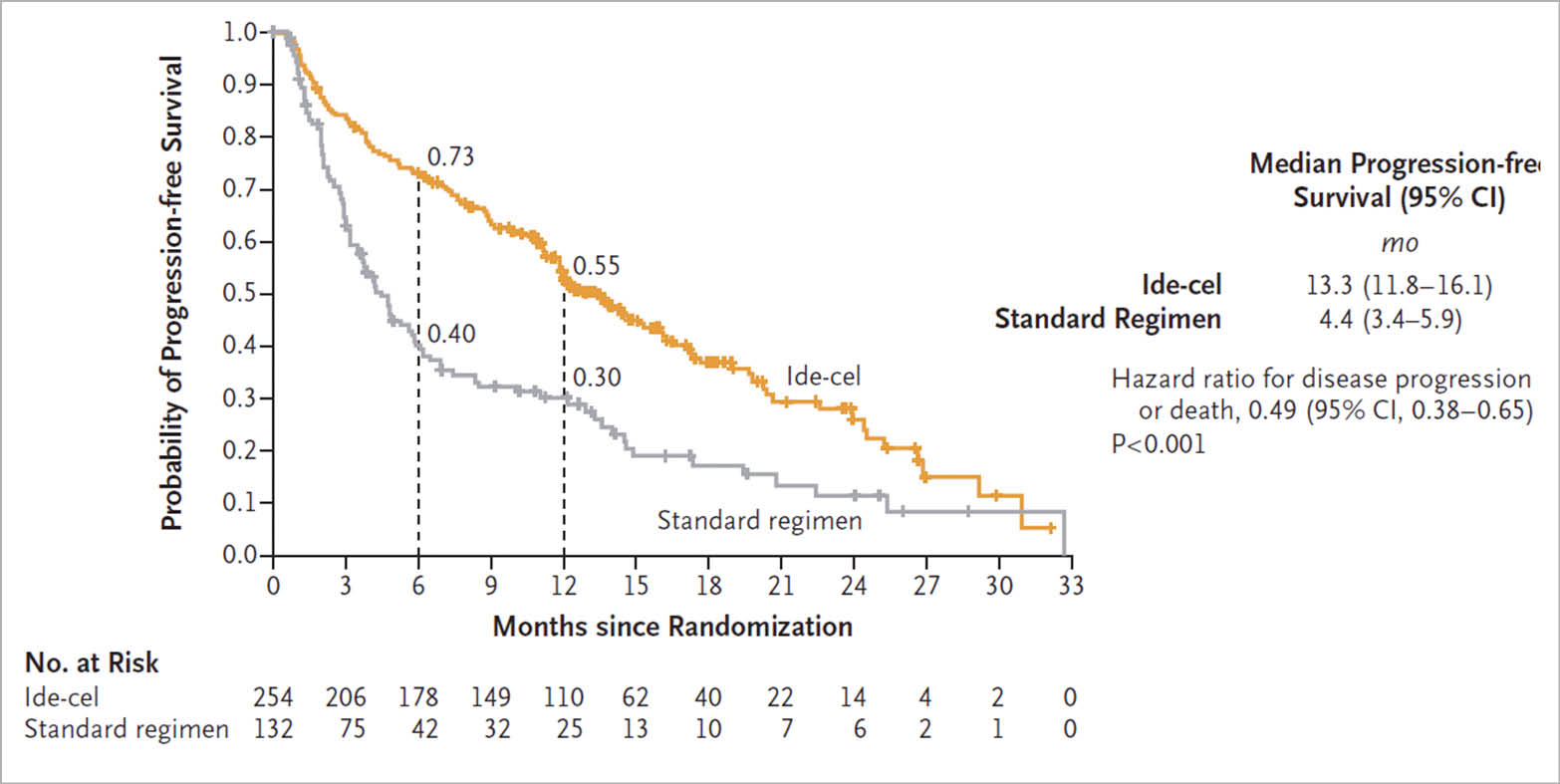 Nach median 18.6 Monaten war das PFS median 13.3 Monate im Ide-cel-Arm im Vergleich zu 4.4 Monaten im Standard-Arm (hazard ratio: 0.49; 95% CI, 0.38 bis 0.65; P<0.001). Ein Ansprechen wurde bei 71% im Ide-cel- Arm und 42% im Standard-Arm beobachtet (P<0.001); eine komplette Remission in 39% und 5%. Grad 3-4 Nebenwirkungen wurden in 93% im Ide-cel-Arm und in 75% im Standard-Arm beobachtet. Im Ide-cel-Arm wurden die immunologischen Nebenwirkungen Cytokine Release Syndrom in 88% und Neurotoxizitäten (ICANS) in 15% beobachtet.