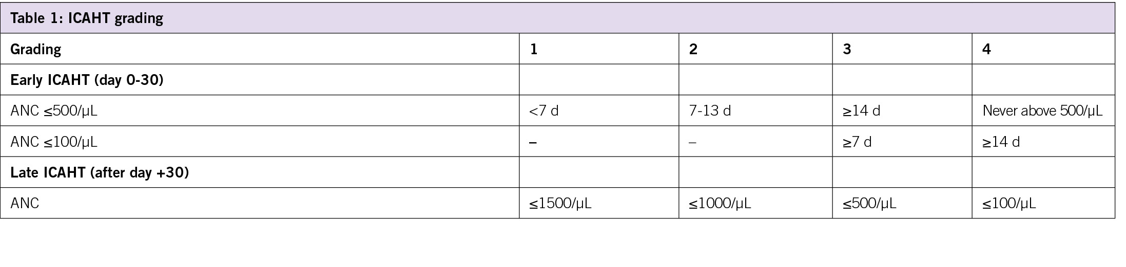 CAR-T Zellen sind gentechnisch veränderte autologe T-Lymphozyten mit einem T-Zell Rezeptor der das CD19 oder das BCMA-Antigen erkennt. CAR-T zelluläre Therapien sind in der Schweiz zugelassen für Lymphome, die akute lymphatische Leukämie (CD19) sowie für Plasma Zell Myelome (BCMA). Die Toxizitäten sind gut bekannt und beschrieben, insbesondere das CRS (Zytokin Freisetzungssyndrom) sowie das ICANS (Immuneffektorzell-assoziiertes Neurotoxizitätssyndrom). Weitere Toxizität schliessen die B-Zell Depletion mit notwendiger Immunglobulinsubstitution sowie hämatologische Ztopenien ein. Dieses Paper beschreibt, gradiert die hämatologischen Zytopenien (ICAHT) und schlägt Behandlungs-Algorithmen vor. Hämatologische Toxizitäten sind häufig nach CAR-T Behandlung, können langdauernd sein und zu infektiösen Komplikationen führen. Für die Gradierung wurde auf die Tiefe und die Dauer der Neutropenie zurückgegriffen (Tabelle), sowie auf den zweiphasigen Verlauf, früh in den ersten 30 Tagen und spät nach 30 Tage nach Behandlung hingewiesen. Risikofaktoren wurden im CAR-HEMATOTOX score zusammengefasst, welcher prätherapeutische Blut- und Entzündungswerte umfasst. Die Risikofaktoren schliessen die Grundkrankheit sowie die Krankheitslast, Vorbehandlungen, Knochenmarksbefall, Inflammation, immunologische und infektiöse Komplikationen mit ein. Zu diesen Toxizitäten gehört auch die CAR-T assoziierte Hämophagozytose. Behandlungsempfehlungen sind Transfusionen, Wachstumsfaktoren, prophylaktische Antiinfektiva und als Ultima Ratio eine Stammzelltransplantation.
