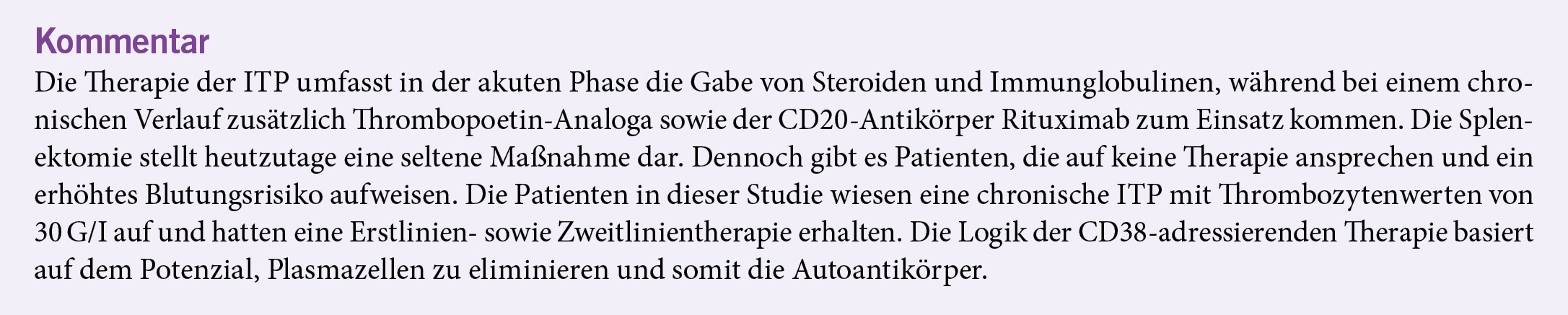 Die Immunthrombozytopenie zählt zu den häufigeren Autoimmunerkrankungen, welche Blutzellen betreffen. Die Therapie der chronischen Verlaufsformen erweist sich als wenig zufriedenstellend. Im Folgenden wird der CD38-Antikörper CM313 vorgestellt. Im Rahmen einer Phase-1- bis -2-Studie wurde der CD38-Antikörper CM313 wöchentlich i. v. in einer Dosis von 16 mg/kg über einen Zeitraum von acht Wochen an erwachsene Patienten verabreicht. Insgesamt wurden 22 Patienten in die Studie eingeschlossen, wobei bei 21 Patienten (95 %) ein Thrombozytenwert von > 50 × 10⁹/L erreicht wurde. Die Ansprechdauer betrug 23 Wochen (17–24 Wochen). Das Ansprechen wurde median innerhalb einer Woche beobachtet. Zu den Nebenwirkungen gehörten Infusionsreaktionen sowie Infektionen der oberen Luftwege.