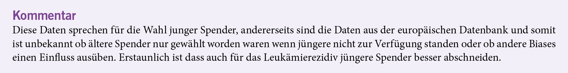 Die allogene Stammzelltransplantation gehört zum Standard bei intermediär und hochrisiko Leukämien. Bei zunehmendem Alter der behandelten Patienten stellen sich Fragen nach der besten Spenderwahl. Gleichzeitig ergeben sich durch die verbesserte Prophylaxe der Graft versus Host Krankheit (GvHD) mit posttransplantärem Cyclophosphamide (PTCy) auch Fragen nach der Rolle des Alters von unverwandten Spendern aus dem Register. In dieser observationellen Studie aus dem Transplantationsregister wurden Patienten mit akuter myeloischer Leukämie in erster oder zweiter Remission mit passendem Fremdspender (MUD) oder Fremdspender mit einem HLA mismatch (MMUD) eingeschlossen. 1011 Patienten wurden untersucht, medianes Alter 54 Jahre (18–77). Spender waren median 29 Jahre (18–64) alt. Ein Spendealter über 30 Jahre hatte einen negativen Einfluss auf den Rückfall nach Transplantation (Hazard Ratio [HR], 1.38 (1.06–1.8), Leukämiefreies Ueberleben (HR, 1.4; 95 % CI, 1.12–1.74), und Gesamtüberleben (HR 1.45; 95 % CI, 1.14–1.85). Der Einfluss von HLA mismatch war nicht signifikant und weniger stark als der des Alters der Spender.