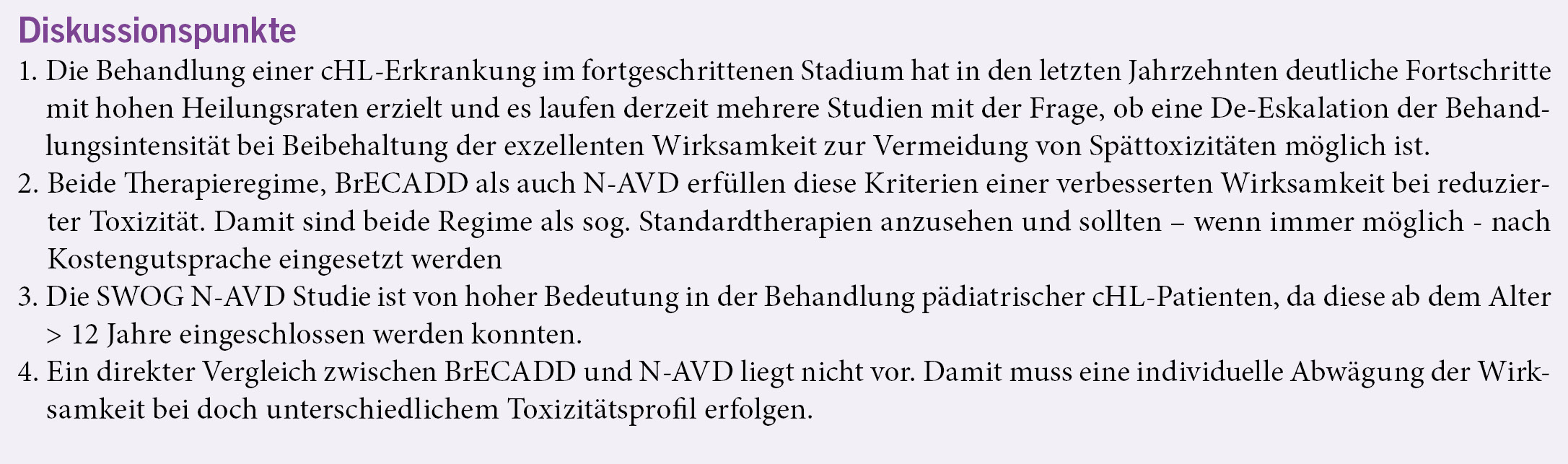 Die Einbeziehung von Brentuximab Vedotin in die Behandlung des klassischen Hodgkin-Lymphoms (cHL) im fortgeschrittenen Stadium verbessert die Ergebnisse bei erwachsenen und pädiatrischen Patienten. Allerdings erhöht Brentuximab Vedotin die toxische Wirkung der Behandlung bei Erwachsenen. Zudem müssen mehr als die Hälfte der behandelten Kinder sich nach der Systemtherapie noch einer konsolidierenden Bestrahlung unterziehen und die Behandlung im Rückfall bleibt eine Herausforderung, auch wenn die Therapie mit PD1-blockierenden Antikörpern eine hohe Wirksamkeit in dieser Situation aufweist. Der Stellenwert einer PD1-blockierenden Antikörpertherapie in der Erstlinientherapie von cHL ist bisher nur in kleinen Kollektiven mit hoffnungsvollen Ergebnissen geprüft worden.