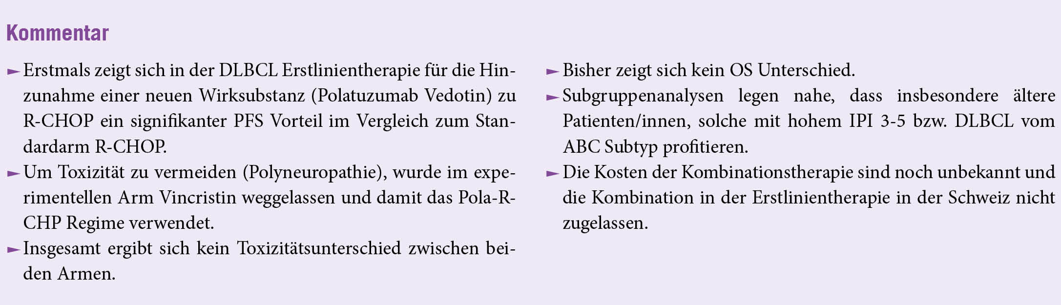 Bei Patienten mit zuvor unbehandeltem DLBCL mit mittlerem oder hohem Risiko war das Risiko eines Fortschreitens der Erkrankung, eines Rückfalls oder des Todes bei denjenigen, die Pola-R-CHP erhielten, geringer als bei denjenigen, die R-CHOP erhielten.