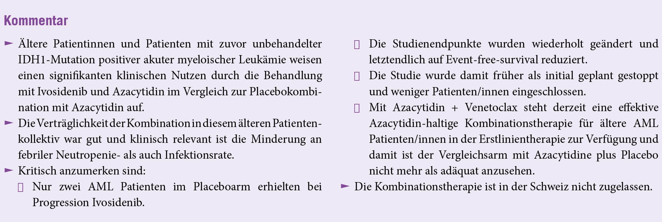 Ivosidenib und Azacytidin zeigten einen signifikanten klinischen Nutzen im Vergleich zu Placebo und Azacytidin in dieser schwierig zu behandelnden Patientengruppe. Febrile Neutropenie und Infektionen traten in der Gruppe mit Ivosidenib und Azacytidin seltener auf, als in der Gruppe mit Placebo und Azacytidin, während Neutropenie und Blutungen in der Gruppe mit Ivosidenib und Azacytidin häufiger auftraten.