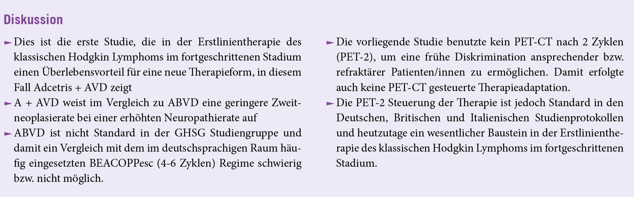 Insgesamt wurden 664 Patienten/innen für die Behandlung mit A+AVD und 670 für die Behandlung mit ABVD ausgewählt. Bei einer medianen Nachbeobachtungszeit von 73,0 Monaten waren 39 Patienten/innen in der A+AVD-Gruppe und 64 in der ABVD-Gruppe gestorben (Hazard Ratio, 0,59; 95% Konfidenzintervall [CI], 0,40 bis 0,88; P = 0,009). Das geschätzte 6-Jahres-Gesamtüberleben betrug 93,9% (95% CI, 91,6 bis 95,5) in der A+AVD-Gruppe und 89,4% (95% CI, 86,6 bis 91,7) in der ABVD-Gruppe. Das PFS war für A+AVD länger als für ABVD (Hazard Ratio für das Fortschreiten der Krankheit oder den Tod, 0,68; 95% CI, 0,53 bis 0,86). Weniger Patienten/innen in der A+AVD-Gruppe als in der ABVD-Gruppe erhielten eine Folgetherapie, einschliesslich Transplantation, und bei A+AVD wurden weniger Zweitkrebsfälle gemeldet (bei 23 vs. 32 Patienten). Eine Primärprophylaxe mit Granulozyten-Kolonie-stimulierendem Faktor wurde empfohlen, nachdem bei A+AVD ein erhöhtes Auftreten einer febrilen Neutropenie beobachtet wurde. Die Neuropathierate war unter A+AVD höher als unter ABVD.