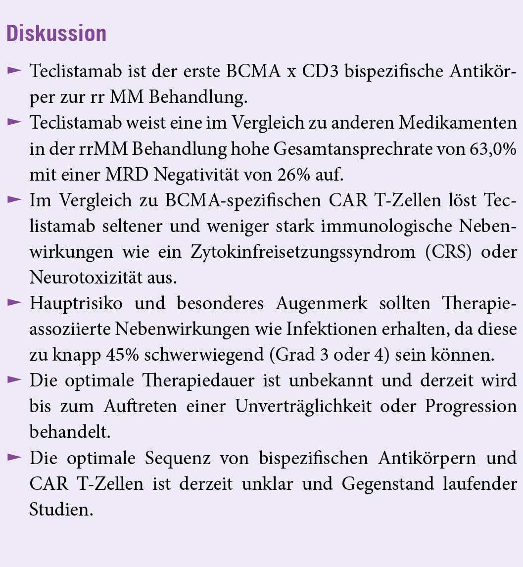 Von den 165 Patienten/innen, die Teclistamab erhielten, hatten 77,6 % eine refraktäre Erkrankung gegen drei Substanzklassen (im Median fünf vorangegangene Therapielinien). Bei einer medianen Nachbeobachtungszeit von 14,1 Monaten lag die Gesamtansprechrate bei 63,0 %, wobei 65 Patienten/innen (39,4 %) ein vollständiges Ansprechen oder besser zeigten. Bei insgesamt 44 Patienten/innen (26,7 %) wurde keine minimale Resterkrankung (MRD) gefunden. Die mediane Ansprechdauer betrug 18,4 Monate (95% Konfidenzintervall [CI], 14,9 bis nicht abschätzbar). Die mediane Dauer des progressionsfreien Überlebens (PFS) betrug 11,3 Monate (95 % CI, 8,8 bis 17,1). Zu den häufigsten unerwünschten Ereignissen zählten das Zytokinfreisetzungssyndrom (bei 72,1 % der Patienten/innen; Grad 3, 0,6 %; kein Grad 4), Neutropenie (bei 70,9%; Grad 3 oder 4, 64,2%), Anämie (bei 52,1%; Grad 3 oder 4, 37,0%) und Thrombozytopenie (bei 40,0%; Grad 3 oder 4, 21,2%). Infektionen waren häufig (76,4 %; Grad 3 oder 4, 44,8 %). Neurotoxische Ereignisse traten bei 24 Patienten/innen (14,5 %), darunter ein mit Immuneffektorzellen assoziiertes Neurotoxizitätssyndrom bei 5 Patienten (3,0 %; alle Grad 1 oder 2).
