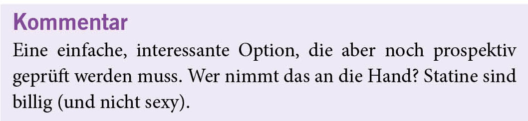 Der Gedanke, ein leicht verfügbares Medikament mit nachgewiesenem kardiovaskulärem Nutzen und günstigem Toxizitätsprofil wie Statine in die Behandlung von Prostatakrebs einzubeziehen, ist spannend. In dieser systematischen Übersichtsarbeit und Meta-Analyse von Beobachtungsstudien konnte ein signifikanter Vorteil für die Gesamtmortalität und die Prostatakrebs-spezifische Mortalität bei gleichzeitiger Einnahme von Statinen bei Männern festgestellt werden, die eine androgenablative Therapie erhalten. Die Ergebnisse tragen zu unserem Verständnis der Zusammenhänge zwischen Prostatakrebs, der Androgenachse und Statinen bei und liefern hochwertige Belege für eine chemopräventive Rolle von Statinen bei Prostatakrebs. Die Verwendung retrospektiver Daten und die unerklärliche Heterogenität verringern jedoch die Zuversicht, die Ergebnisse direkt in die klinische Praxis einfliessen zu lassen. Auf der Suche nach dem optimalen Umfeld für eine erfolgreiche Behandlung von Prostatakrebs mit Statinen muss noch die optimale Statindosis und -klasse bestimmt werden. «Die Zeit ist reif für gut konzipierte, randomisierte klinische Studien, um die Wirkung von Statinen auf das Überleben bei Prostatakrebs zu untersuchen», so die Autoren.