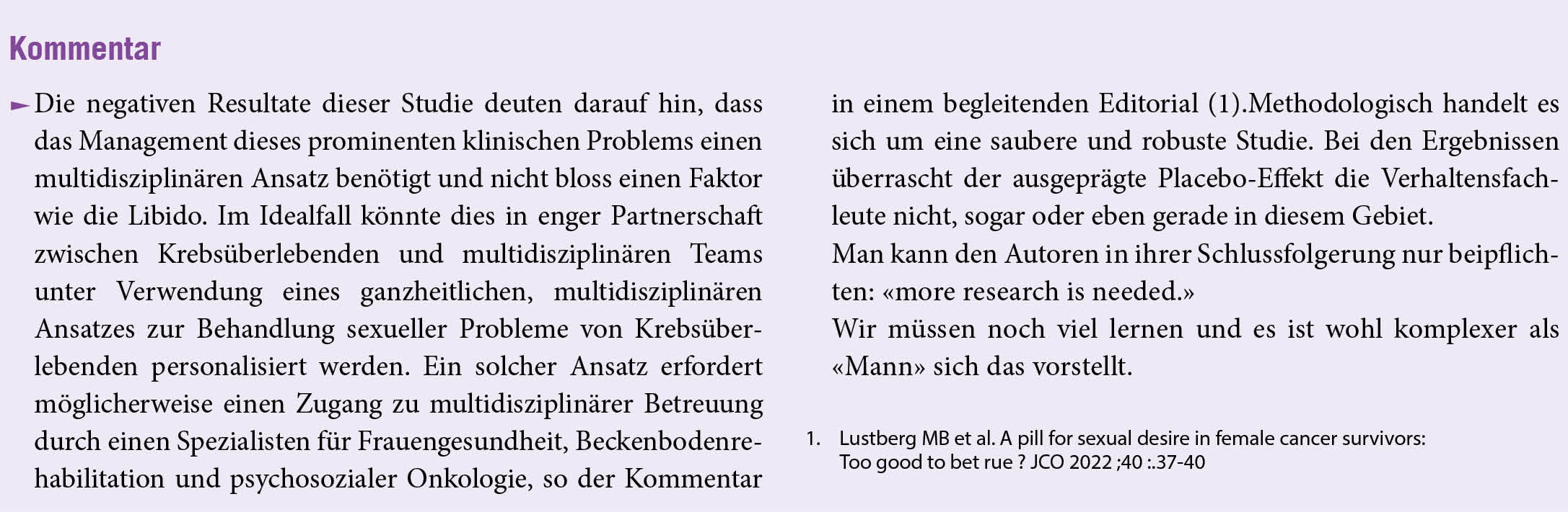 Aufgrund der negativen Auswirkungen einer Krebsbehandlung auf die weibliche Sexualfunktion sind wirksame Behandlungen gerechtfertigt. Ziel einer kürzlich publizierten Multistudie war es, die Fähigkeit mit zwei Dosisstufen von Bupropion, einem dopaminergen Wirkstoff mit verlängerter Wirkstofffreisetzung, das sexuelle Verlangen nach neun Wochen stärker zu verbessern als mit Placebo. Anhand der Unterskala des «Female Sexual Function Index (FSFI)», wurde das Resultat und die damit verbundenen Toxizitäten bewertet.