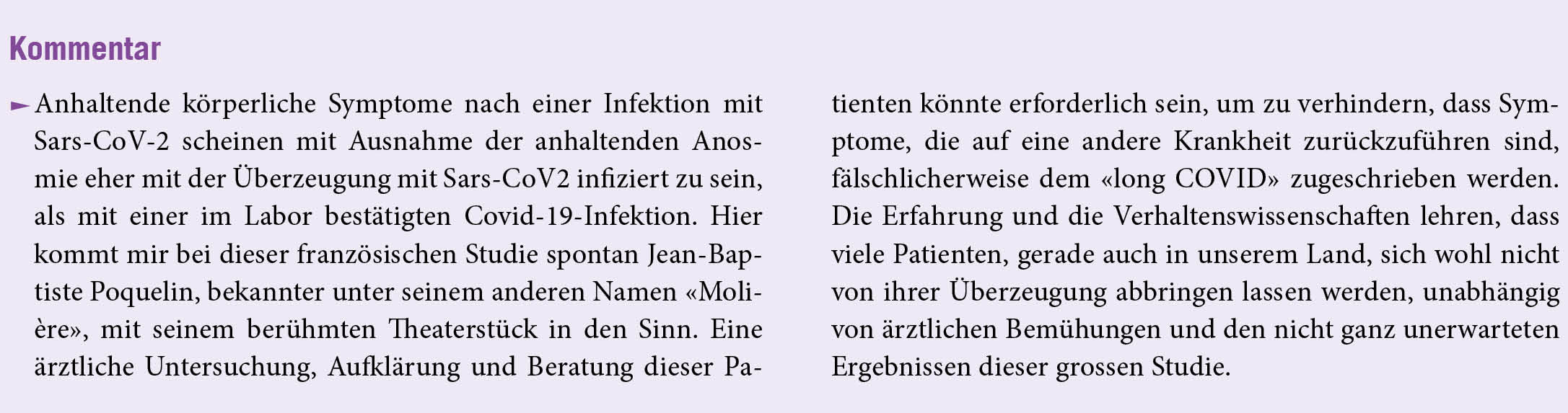 Die Ergebnisse dieser Querschnittsanalyse einer großen bevölkerungsbasierten französischen Kohorte deuten darauf hin, dass anhaltende körperliche Symptome nach einer COVID-19-Infektion eher mit der Überzeugung, mit SARS-CoV-2 infiziert worden zu sein, als dass sie mit einer im Labor bestätigten COVID-19-Infektion in Verbindung gebracht werden können.