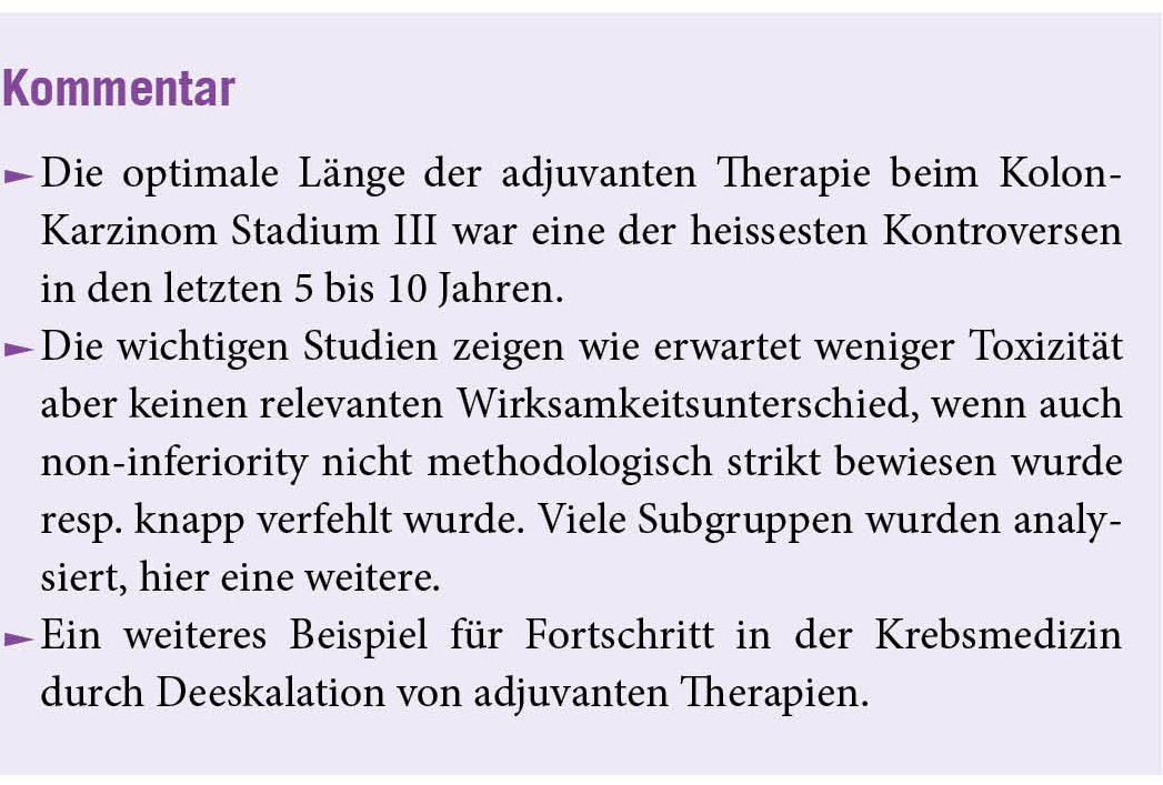 In der IDEA-Kooperation (International Duration Evaluation of Adjuvant Therapy) wurde untersucht, ob die Verabreichung von 3 Monaten adjuvantem FOLFOX oder CAPOX bei Patienten mit Darmkrebs im Stadium III einer Behandlung von 6 Monaten nicht unterlegen wäre. Noninferiority wurde definiert als die Obergrenze des 2-seitigen 95%-CI der Hazard Ratio (HR) für DFS bis über 1,12. In der Gesamtbevölkerung betrug die HR für DFS 1,07 (95% CI, 1,00 bis 1,15); Daher wurde keine Unterlegenheit nachgewiesen, obwohl sie bei Patienten, die CAPOX erhielten, und insbesondere in der Niedrigrisiko-Untergruppe von Patienten mit T1-3- und N1-Tumoren bestätigt wurde.14 Eine anschliessende Analyse des OS unterstützte die Verwendung von 3 Monaten adjuvanter CAPOX-Therapie.