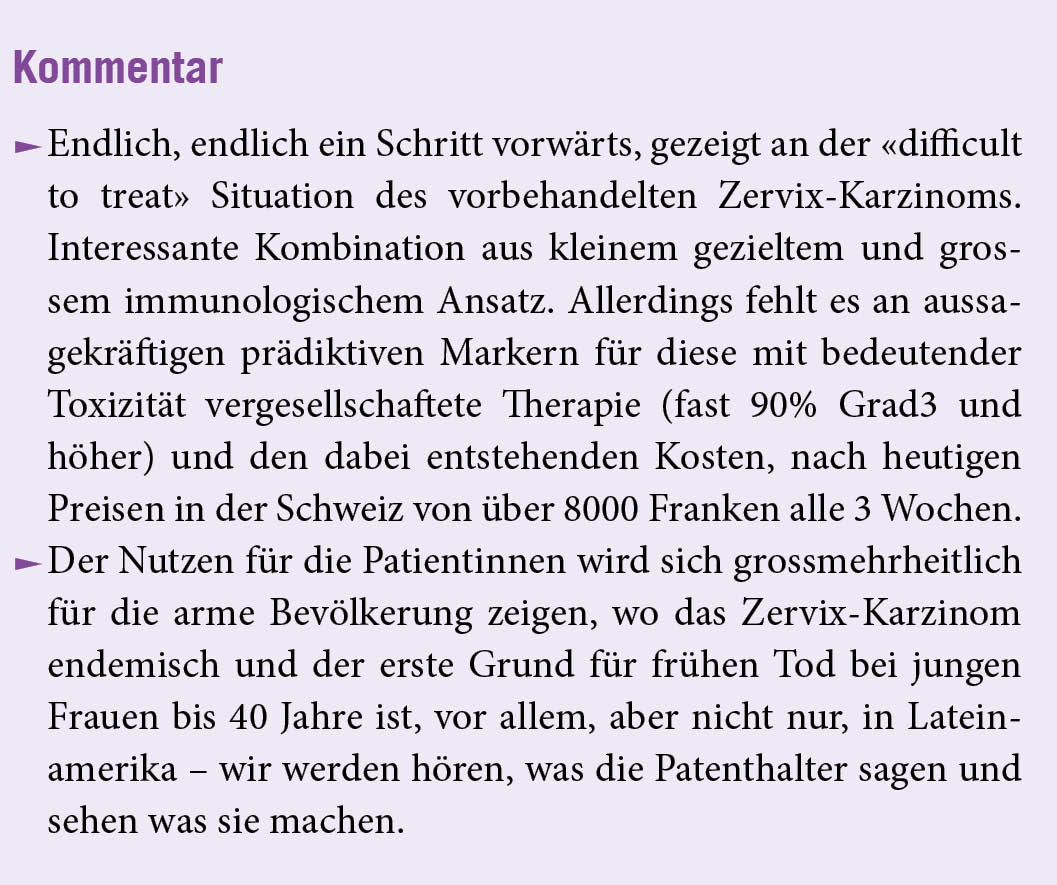Eine Standardtherapie bei fortgeschrittenem Endometrium­karzinom nach Versagen der platinbasierten Chemotherapie mit oder ohne anti-VEGF, in der Schweiz meist Carboplatin-Paclitaxel, gibt es nicht. In einer Phase-3-Studie wurden Patientinnen mit fortgeschrittenem Endometriumkarzinom, die zuvor mindestens eine platinbasierte Chemotherapie erhalten hatten, nach dem Zufallsprinzip im Verhältnis 1:1 zugewiesen entweder Lenvatinib (20 mg, einmal täglich oral verabreicht) plus Pembrolizumab (200 mg, intravenös alle 3 Wochen verabreicht) oder eine Chemotherapie nach Wahl des behandelnden Arztes (Doxorubicin bei 60 mg pro Quadratmeter Körperoberfläche) intravenös alle 3 Wochen verabreicht, oder Paclitaxel bei 80 mg pro Quadratmeter, intravenös wöchentlich verabreicht [mit einem Zyklus von 3 Wochen ein und 1 Woche frei]) zu erhalten. Die beiden primären Endpunkte waren das progressionsfreie Überleben, wie es bei einem verblindeten unabhängigen zentralen Review gemäss den Response Evaluation Criteria in Solid Tumors, Version 1.1, und dem Gesamtüberleben bewertet wurde. Die Endpunkte wurden bei Patienten mit «Mismatch-Repair Erkrankung (pMMR) und bei allen Patienten ausgewertet. Auch die Sicherheit wurde bewertet.