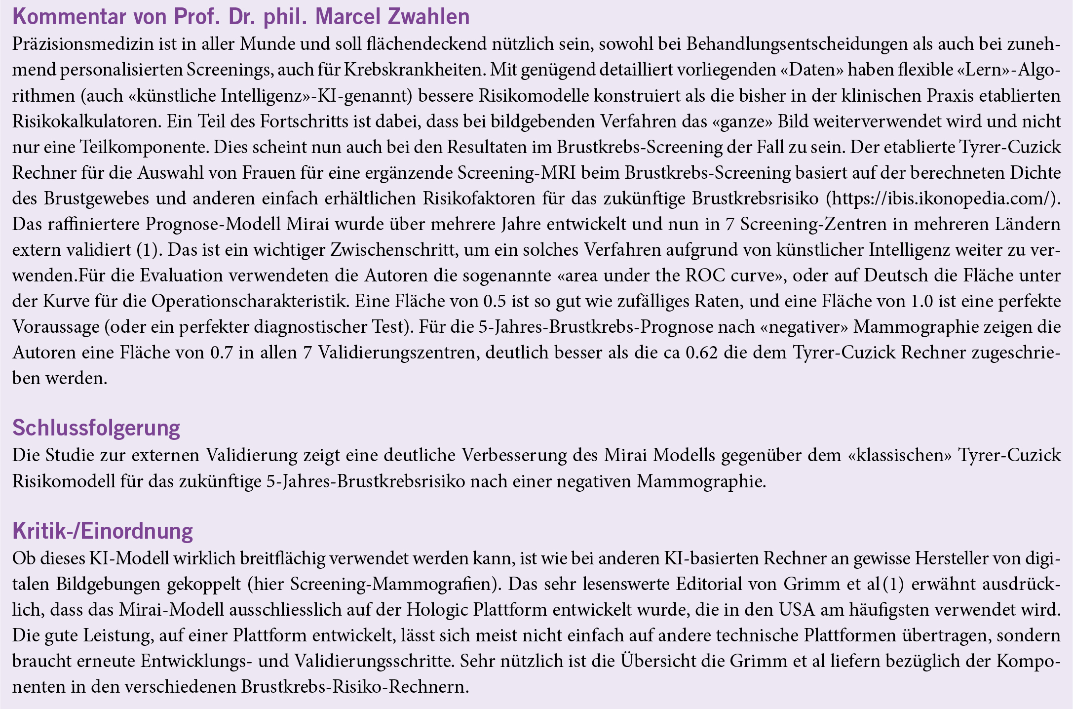 Eine genaue Risikobewertung ist für den Erfolg von Populations-Screening-Programmen bei Brustkrebs unerlässlich. Modelle mit hoher Sensitivität und Spezifität würden es den Programmen ermöglichen, ausgefeiltere Screening-Bemühungen auf Hochrisikopopulationen auszurichten und gleichzeitig die Überbehandlung für den Rest zu minimieren. Auf künstlicher Intelligenz basierende Risikomodelle haben einen signifikanten Fortschritt gegenüber den heute in der klinischen Praxis verwendeten Risikomodellen gezeigt. Der verantwortungsvolle Einsatz derartiger neuer Risikomodelle erfordert jedoch eine sorgfältige Validierung über verschiedene Bevölkerungsgruppen hinweg. Zu diesem Zweck wurde das auf künstlicher Intelligenz basierte Modell Mirai über global unterschiedliche Screening-Populationen hinweg getestet.