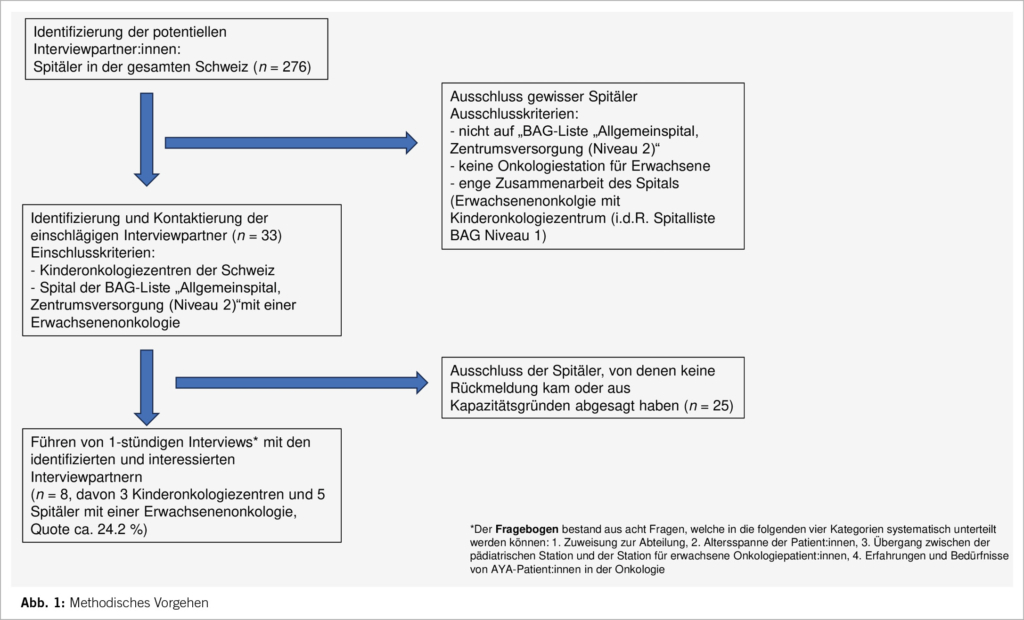 Zur Beantwortung der Forschungsfrage, auf welchen Abteilungen AYA behandelt werden, wurden Interviews mit Spitälern in der Schweiz durchgeführt. Es wurden insgesamt 33 Spitäler kontaktiert. Mit acht Spitälern kam ein Interview zustande. Das detaillierte Vorgehen kann der Grafik entnommen werden (Abb. 1).