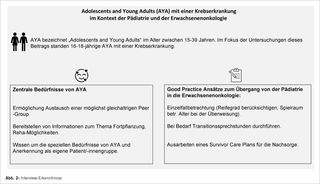 AYA haben besondere Bedürfnisse, die sich von denjenigen der Kinder und auch von Erwachsenen unterscheiden. Im Ausland, z.B. in den USA, gibt es deshalb eigene AYA-Zentren, die an die Erwachsenenonkologie (4) oder an die Pädiatrie (5) angegliedert sind. In der Schweiz werden AYA hingegen nicht als eigene Interessensgruppe in der Medizin wahrgenommen, sondern entweder zusammen mit Kindern oder mit Erwachsenen behandelt (6). Es bestehen keine klaren gesetzlichen Regelungen, ob AYA in der Schweiz in einem Kinderonkologiezentrum oder auf der Erwachsenenstation behandelt werden. Der vorliegende Beitrag stellt die durchgeführte Interviewstudie vor, mit der Forschungsfrage: «Wo werden AYA – insbesondere 16- bis 18-jährige – mit Krebserkrankungen in der Schweiz behandelt?». Zudem wurden die Vor- und Nachteile der verschiedenen Vorgehensweisen näher betrachtet.