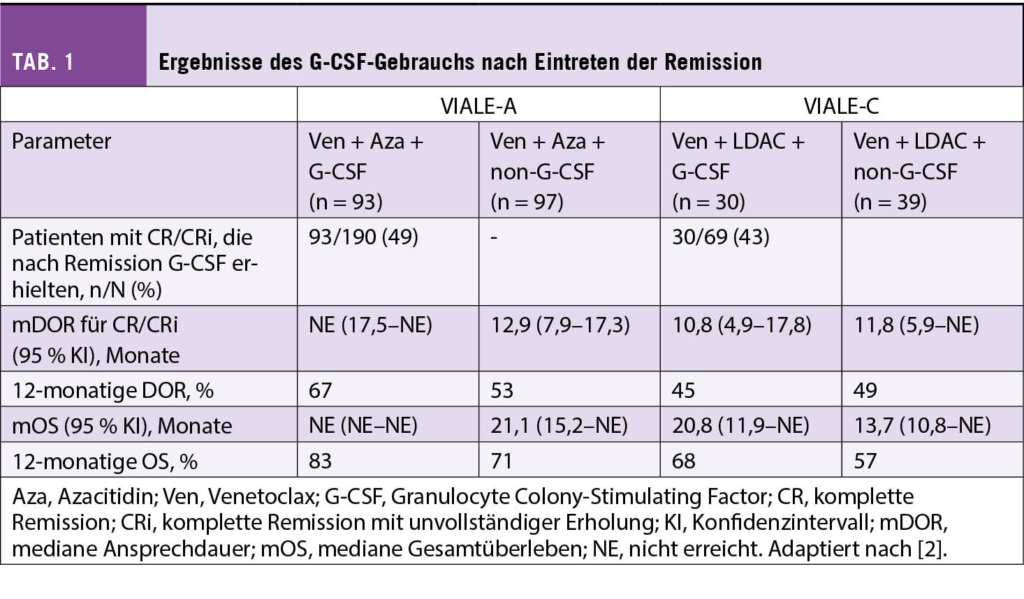 In der VIALE-A Studie erreichten 190 der 286 Patienten unter Ven + Aza eine komplette Remission oder eine komplette Remission mit unvollständiger Erholung (CR/CRi). Die Hälfte dieser Patienten erhielt median 36 Tage nach Eintreten der Remission G-CSF. In der VIALE-C Studie wurden 43 % der Patienten, die unter Ven + LDAC ein CR/CRi zeigten, mit G-CSF behandelt (Tabelle). Hier betrug die mediane Zeit zum ersten G-CSF Gebrauch nach Remission 30 Tage. Der Einfluss auf die Dauer des Ansprechens (DOR), das mediane Gesamtüberleben (mOS) und die Rate sowie die Dauer von Neutropenie und febriler Neutropenie ≥ 3. Schweregrades wurde untersucht [2].
