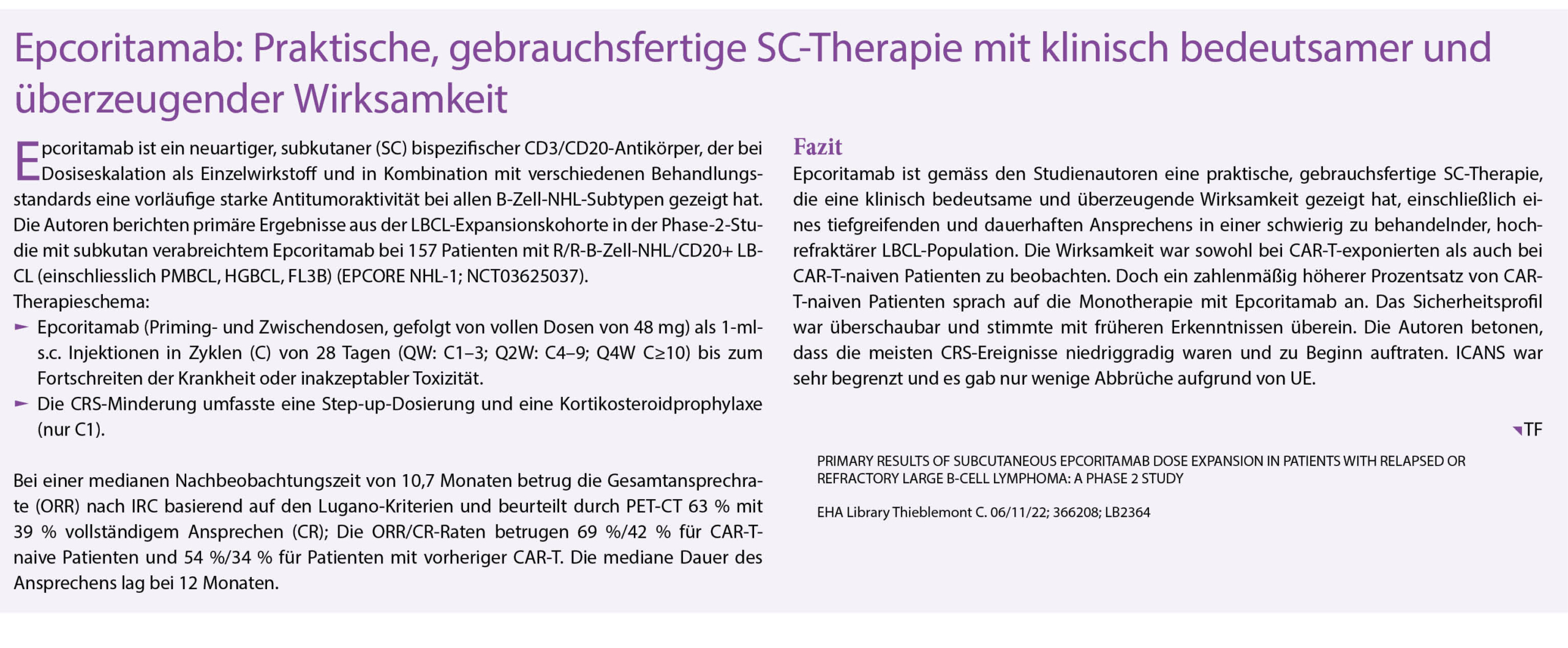 Glofitamab mit fester Dauer induziert laut Studienautoren dauerhafte vollständige Remissionen und hat eine günstige Sicherheit bei Patienten mit R/R DLBCL und ≥ 2 vorherigen Therapien. Dies betrifft auch Patienten mit vorheriger Exposition gegenüber CAR-Ts. Glofitamab ist nach Ansicht der Autoren eine vielversprechende neue Therapie für Patienten mit stark vorbehandeltem und/oder hochrefraktärem DLBCL.