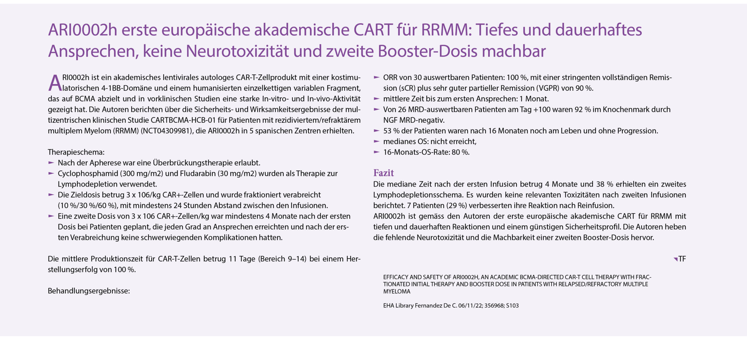 • Die CR-Raten waren bei Patienten mit und ohne vorherige CAR-Ts konsistent (32 % vs. 37 %).