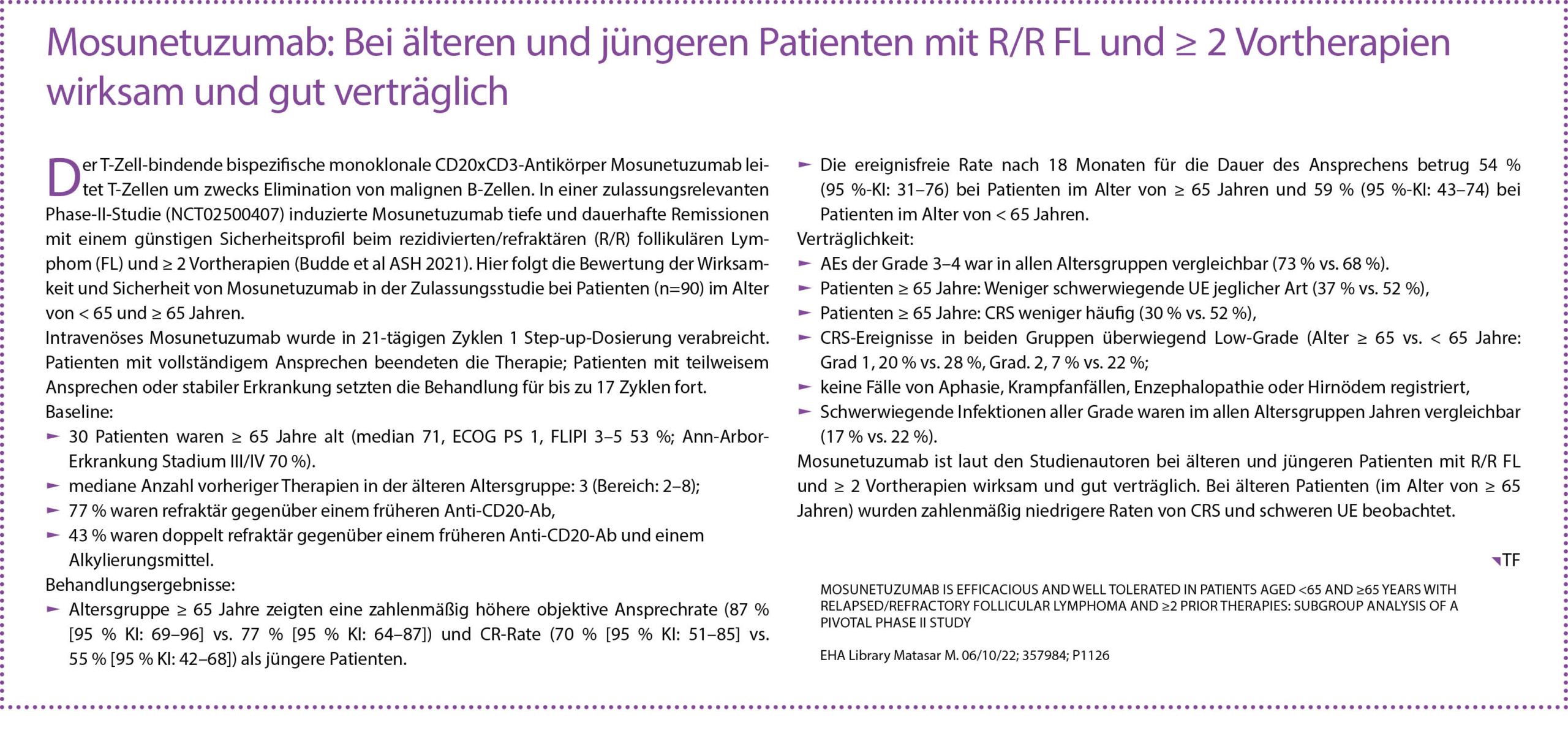 4. Erneut beeindruckend sind die Entwicklungen beim Multiplen Myelom und anderen B-Zell Lymphomen auf dem Gebiet der zellulären als auch Antikörper basierten Immuntherapie. So wurden Aktualisierungen zur CAR-T-Zelltherapie (z.B. ZUMA-7) präsentiert, aber auch neue Studiendaten zum Einsatz bispezifischer Antikörper wie Glofitamab bzw. Epcoritamab beim aggressiven B-Zell Lymphom oder auch Teclistamab beim Multiplen Myelom. Diese in der Regel ambulant durchzuführenden Antikörpertherapien zeigen hohe Ansprechraten mit deutlicher PFS Verlängerung bei akzeptabler Toxizität und stellen eine wesentliche Erweiterung unseres Behandlungsspektrum dar.