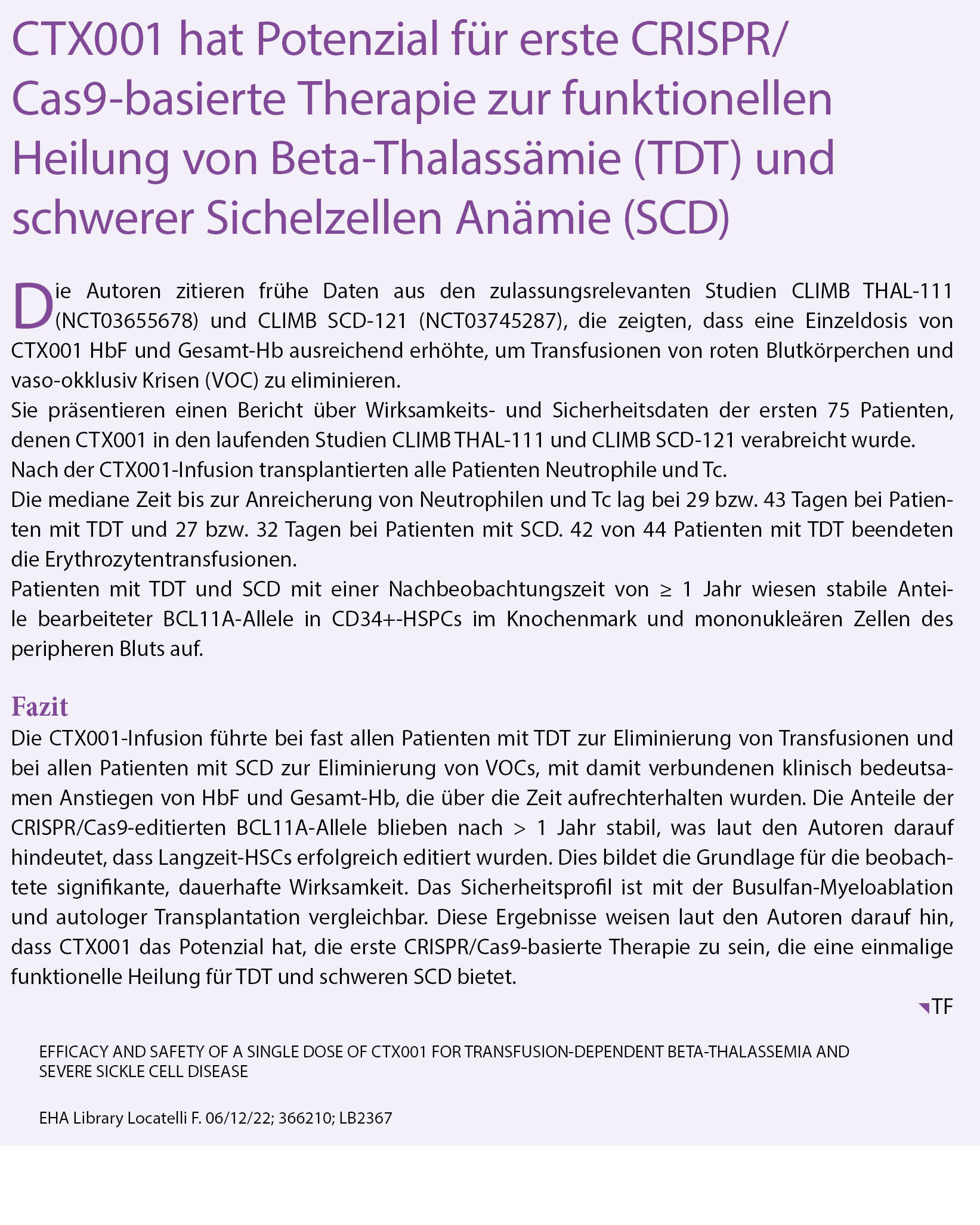 Die CTX001-Infusion führte bei fast allen Patienten mit TDT zur Eliminierung von Transfusionen und bei allen Patienten mit SCD zur Eliminierung von VOCs, mit damit verbundenen klinisch bedeutsamen Anstiegen von HbF und Gesamt-Hb, die über die Zeit aufrechterhalten wurden. Die Anteile der CRISPR/Cas9-editierten BCL11A-Allele blieben nach > 1 Jahr stabil, was laut den Autoren darauf hindeutet, dass Langzeit-HSCs erfolgreich editiert wurden. Dies bildet die Grundlage für die beobachtete signifikante, dauerhafte Wirksamkeit. Das Sicherheitsprofil ist mit der Busulfan-Myeloablation und autologer Transplantation vergleichbar. Diese Ergebnisse weisen laut den Autoren darauf hin, dass CTX001 das Potenzial hat, die erste CRISPR/Cas9-basierte Therapie zu sein, die eine einmalige funktionelle Heilung für TDT und schweren SCD bietet.
