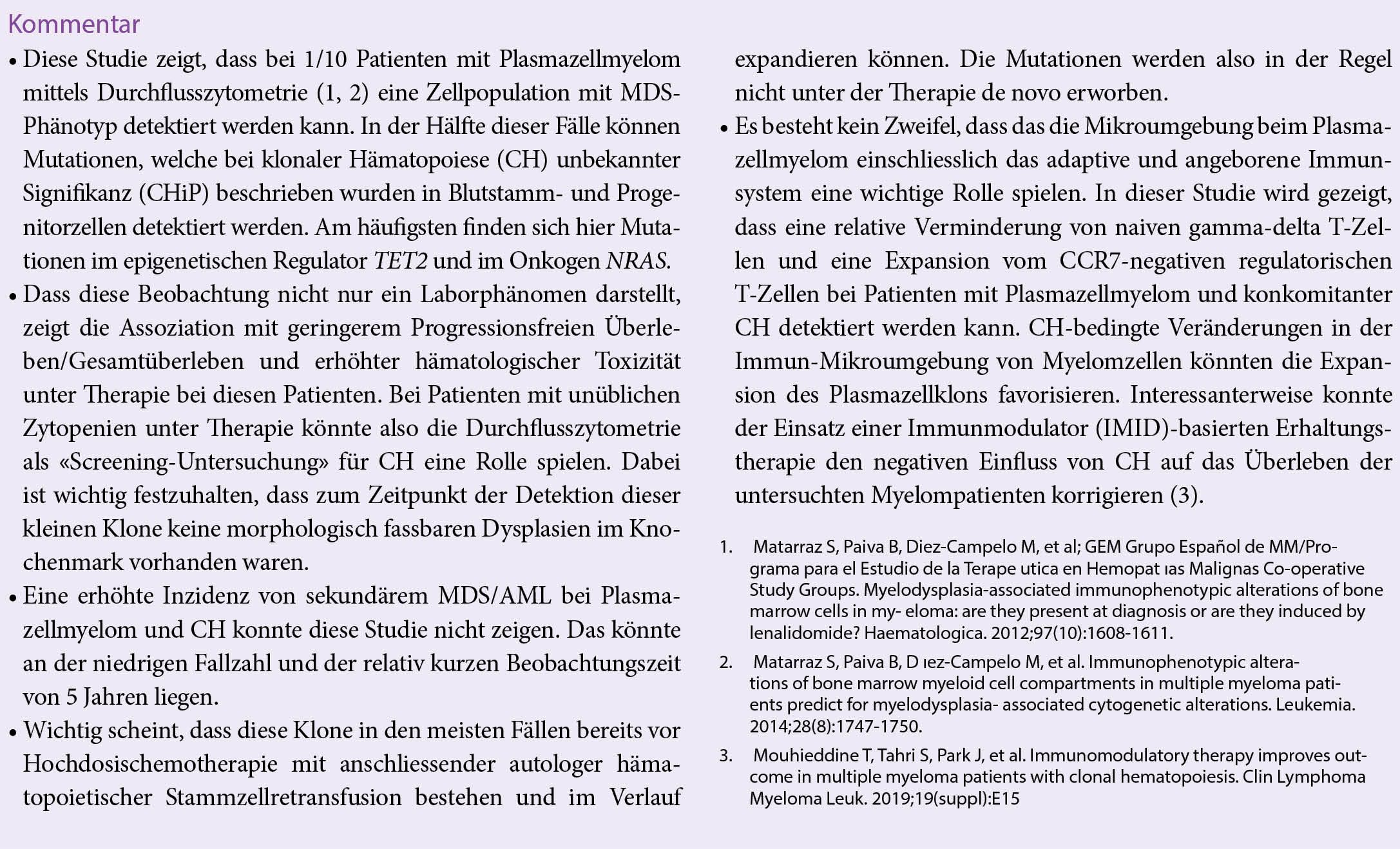 Bemerkenswert ist, dass MDS-assoziierte Mutationen selten nach einer hochdosierten Therapie auftraten. Basierend auf dem MFC-Profiling haben Patienten mit MDS-PA eine veränderte Hämatopoese und Verteilung T-regulierender Zellen in der Tumormikroumgebung. Wichtig ist, dass das Vorhandensein von monozytärem MDS-PA bei der Diagnose ein grösseres Risiko hämatologischer Toxizität bedeutete und unabhängig mit geringerem progressionsfreiem Überleben (Hazard Ratio, 1,5; P 5,02) und Gesamtüberleben (Hazard Ratio, 1,7; P 5,01) assoziiert war.