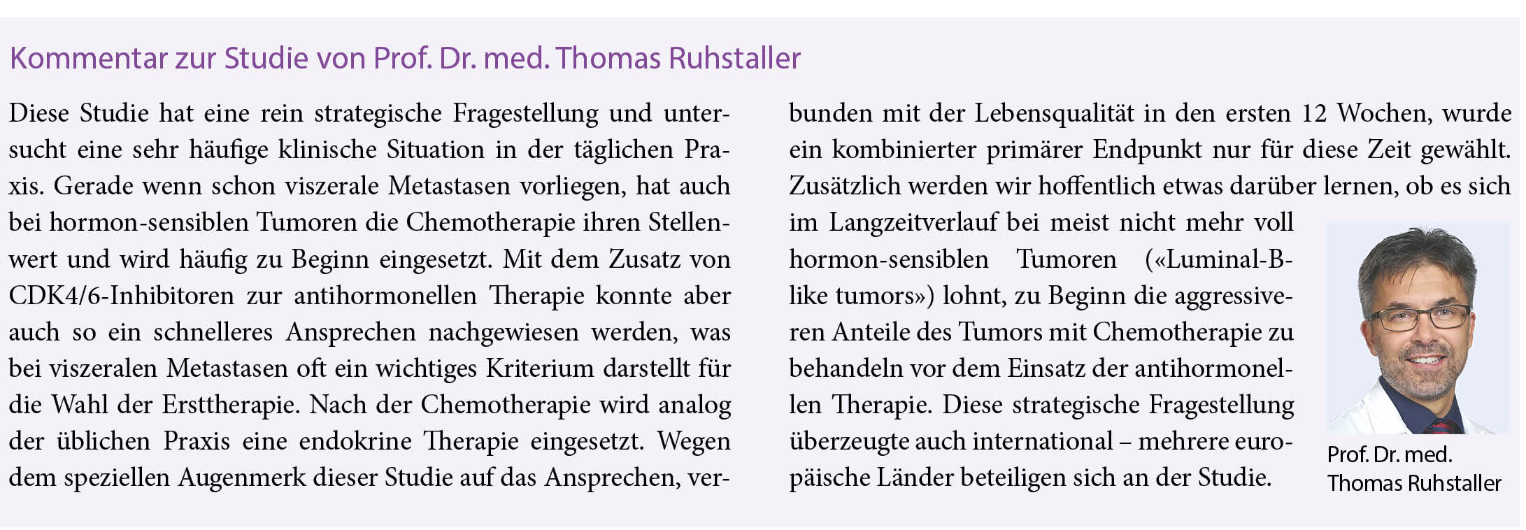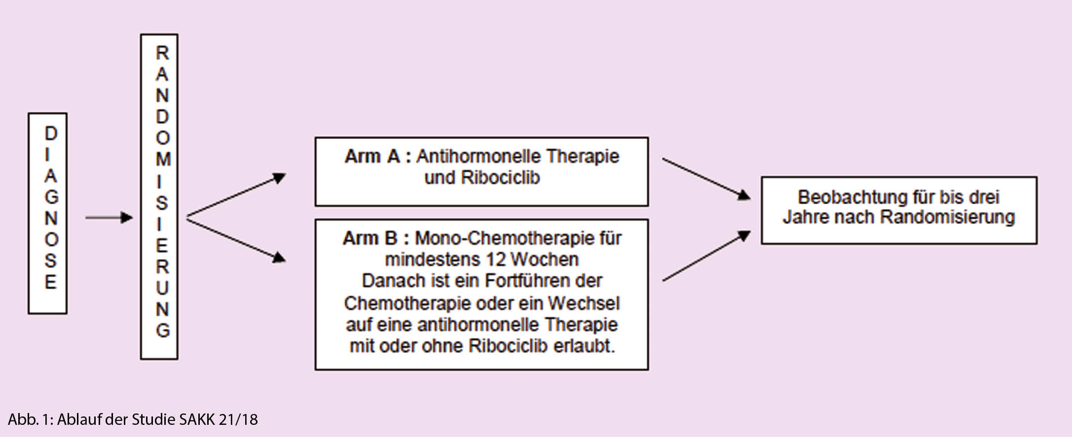 In der Studie SAKK 21/18 werden Patientinnen mit hormonrezeptor-positivem Brustkrebs und viszeraler Metastasierung in zwei Gruppen randomisiert: Sie erhalten entweder die Kombination von Ribociclib (Kisqali®, ein selektiver CDK4/CDK6-Kinase-Hemmer) und endokriner Therapie oder eine Chemotherapie. Der primäre Endpunkt bezieht sich nur auf die ersten 12 Wochen und untersucht die Krankheitskontrolle – stabile Erkrankung oder besser – und gleichzeitig die Lebensqualität der Patientinnen (unter Einbezug der Nebenwirkungen der Therapie) während dieser Zeit. Bei den sekundären Endpunkten werden die üblichen Parameter untersucht: objektive Response-Rate (ORR), progressionsfreies Überleben (PFS) und Gesamtüberleben (OS) nach drei Jahren.