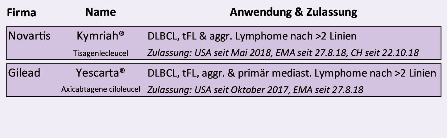 Nach den ersten positiven Erfahrungen mit anti-CD19 CAR-T-Zellen bei der akuten, lymphatischen Leukämie < 26 Jahren wurde die Entwicklung bei Erwachsenen mit Rezidiven oder refraktären aggressiven Lymphomen weitergeführt. Dies hat im Oktober 2017 in den USA und im August 2018 auch zur Zulassung der zwei ersten kommerziellen Produkte durch die EMA geführt. Grundlage dazu waren die Resultate der ZUMA-1 und JULIET-Studien (5). In der Schweiz ist seit dem 22.10.2018 Kymriah® in der gleichen Indikation sowie für die akute lymphatische Leukämie bei Kindern und jungen Erwachsenen zugelassen (Tab. 1).