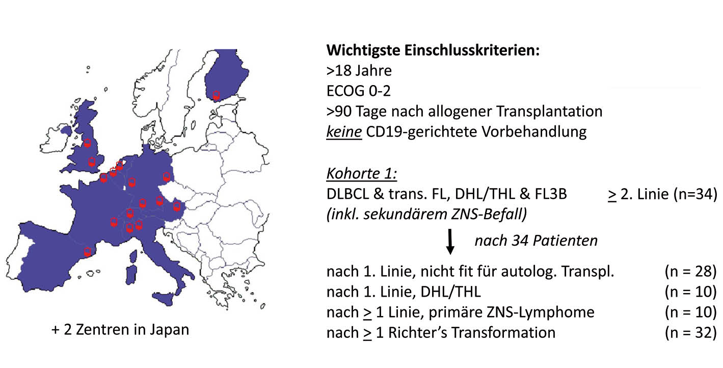 Das dritte Konstrukt JCAR017 von Celgene wird in einem CD4/CD8-Verhältnis von 1:1 und in einer fixen Zieldosis von 1 x 108 T-Zellen verabreicht. Die Resultate der TRANSCEND-Studie von 140 amerikanischen Patienten, vorgestellt am ASH 2017, ergab bei einer vergleichsweise bisher kurzen Beobachtungszeit von 6.2 Monaten eine Ansprechrate von 74%, die in 52% komplett war und dann median 9.2 Monate anhielt. Die Wirksamkeit und Logistik zur Verabreichung von JCAR017 wird derzeit im Rahmen der JCAR017-BCM-001 Studie auch in 16 europäischen und 2 japanischen Zentren weiter untersucht (Abb. 1).
