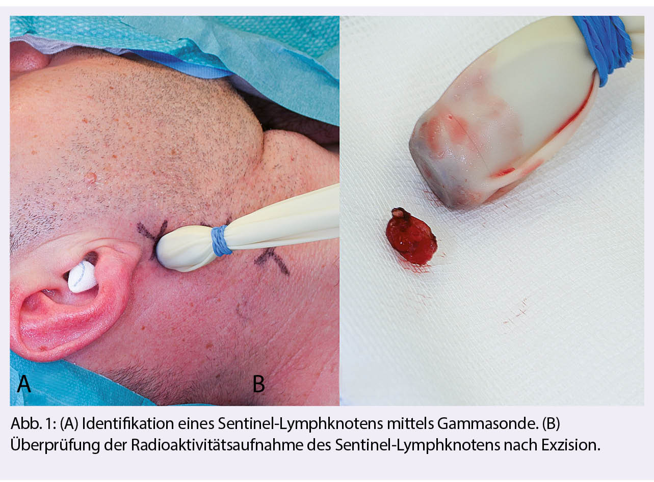 Mundhöhlenkarzinome sind wegen ihrer guten Zugänglichkeit noch immer eine Domäne der Chirurgie, die in dieser Lokalität der RT(CX) bezüglich Mortalität überlegen ist (12). Je nach T-Stadium und Infiltrationstiefe wird die Resektion mit einer selektiven Neckdissection (ND) oder immer häufiger auch mit SLKB (T1-2 N0) (Abb. 1) kombiniert. Diese beiden Strategien sind bei Frühkarzinomen onkologisch gleichwertig (1, 7, 31, 49). Auch bei lokal-fortgeschrittenen Tumoren zeigt die Chirurgie mit adjuvanter RT gegenüber einer primären RTCX betreffend dem krankheitsspezifischen Überleben signifikante Vorteile (22).