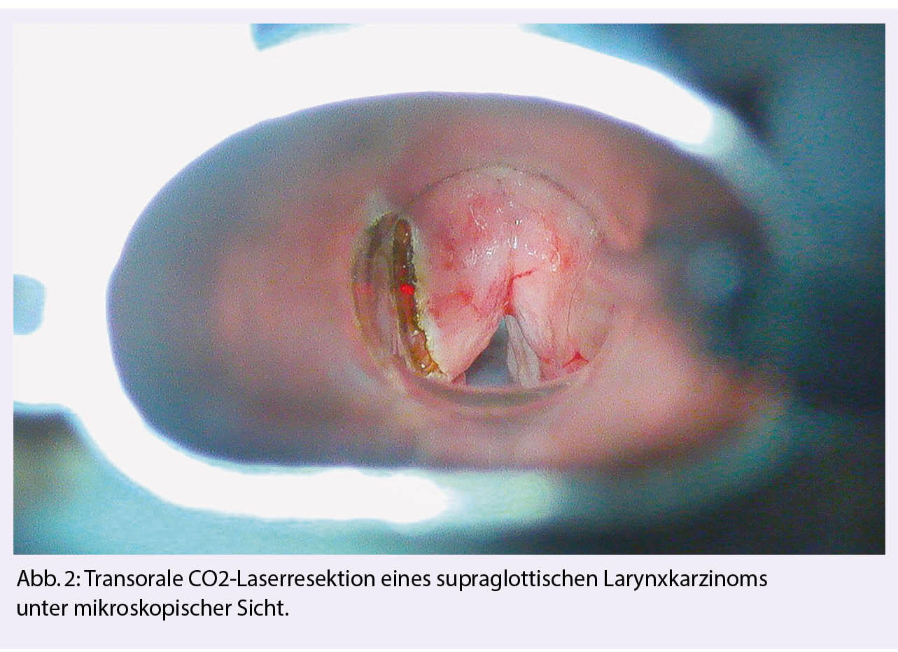 Eine kürzlich publizierte Metaanalyse zeigt auf, dass die Chirurgie bei supraglotischen Karzinomen eine bessere krankheitsspezifische und allgemeine Überlebensrate zu erreichen scheint als die RT (42). Andere Studien resultierten in gleichwertigen onkologischen und funktionellen Resultaten bei supraglottischen/hypopharyngealen Karzinomen nach transoraler Chirurgie (Abb. 2) oder RT (5, 23, 44, 46). Wenn die Möglichkeit besteht, nach einer Operation die RT für Rezidive/Zweitmalignome aufsparen zu können, sollte die Chirurgie als Primärtherapie bevorzugt werden (53). Die Halslymphknoten müssen mitbehandelt werden (23, 44).