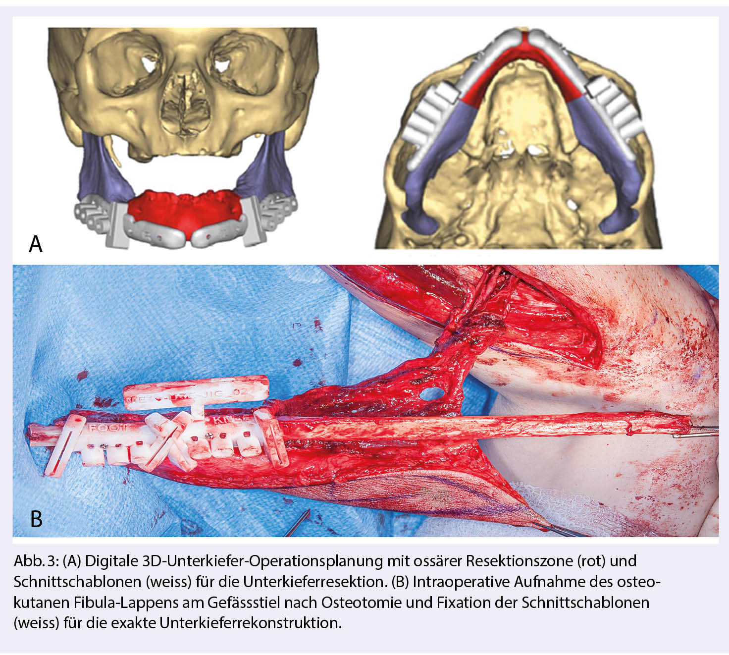 Bei der Rekonstruktion des Unterkiefers hat sich der freie Fibula-Lappen durchgesetzt. Bei schlechter Gefässsituation stehen alternativ der Crista iliaca- oder Skapula-Lappen zur Auswahl, die jedoch schlechtere Voraussetzungen für die dentale Rehabilitation bieten. Resektion und Rekonstruktion werden heute anhand CT-Bilder dreidimensional geplant. Dies erlaubt die Fertigung individueller Schnittschablonen und Osteosyntheseplatten, was die Operation vereinfacht und verkürzt, sowie eine optimale Symmetrie wiederherstellen lässt (Abb. 3) (3, 59).