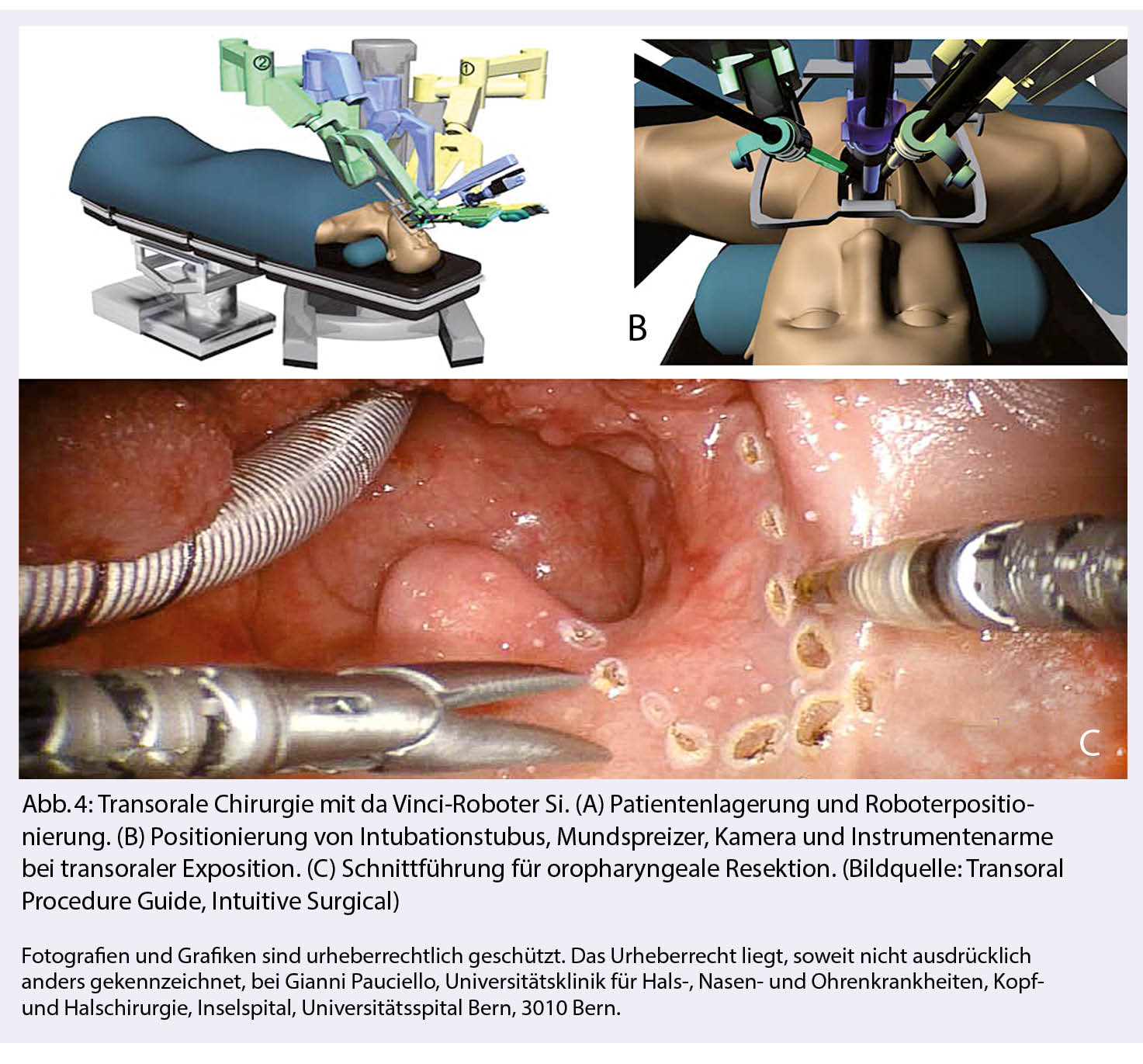 Angesichts der guten Resultate bei Larynxkarzinomen wurde in den 90er Jahren auch bei Oropharynxkarzinomen vermehrt von offener Chirurgie auf die RTCX ausgewichen (58). Neuen Schwung in die Diskussion «Chirurgie vs. RTCX» brachte die Einführung von neuen transoralen Operationstechniken mit Laser (TOLS), Ultraschall (TOUSS) und Roboterunterstützung (TORS), die zu einer deutlichen Verminderung der Morbidität geführt haben.