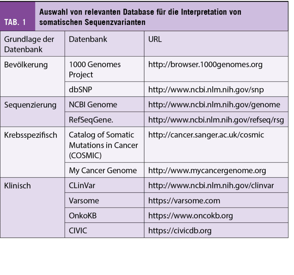Die Auswirkung einer Mutation auf die biologischen und funktionellen Eigenschaften eines Proteins bestimmt die Pathogenität. Bei der Auswertung der Pathogenität werden unter anderem Kriterien wie Häufigkeit der Mutation in der Population, ihre evolutionäre Konservierung, ihr Einfluss auf die Proteinstruktur und –funktion berücksichtigt. Für die Analyse stehen eine Vielfalt an öffentlichen, privaten oder kommerziellen Databanken und «In-silico»-Tools zur Verfügung (Tab. 1). Der Einbezug eines Bioinformatikers ist allgemein empfohlen, aber vor allem bei der Auswertung von komplexeren Varianten indiziert. Basierend auf den Ergebnissen erfolgt die Einteilung nach der international anerkannten American College of Medical Genetics and Genomics (ACMG) Klassifikation in (i) pathogen, (ii) wahrscheinlich pathogen, (iii) ungewisse Bedeutung, (iv) wahrscheinlich gutartig, oder (v) gutartig (5, 6). Lediglich die Varianten die als pathogen oder wahrscheinlich pathogen klassifiziert werden, sind auch als therapierelevant einzuschätzen. Solche Varianten müssten in jedem molekular-pathologischen Bericht aufgeführt werden.
