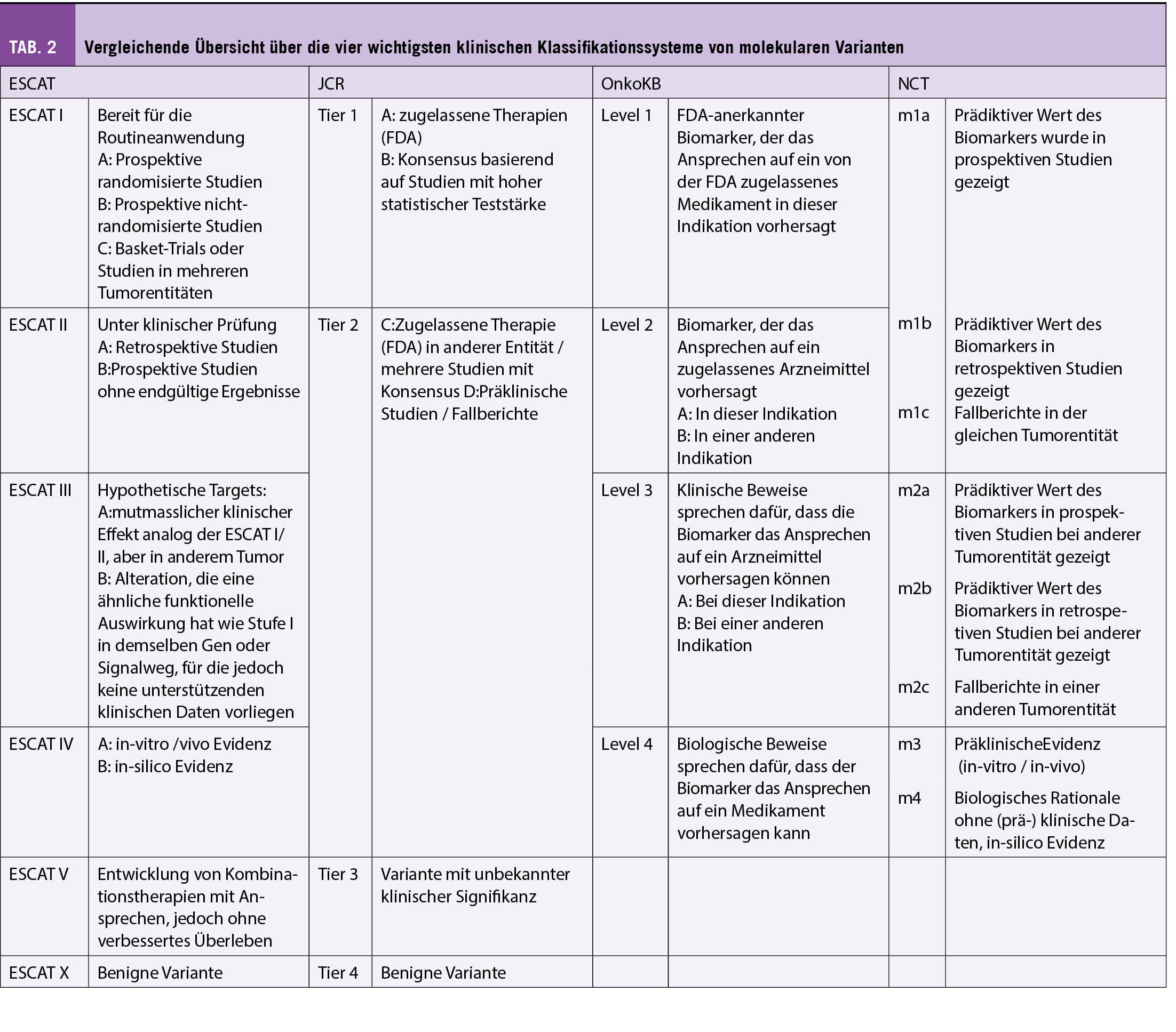 - ESMO Scale for Clinical Actionability of Molecular Targets (ESCAT): diese Klassifikation wurde 2018 von der Europäischen Gesellschaft für Medizinische Onkologie (ESMO) eingeführt (8).