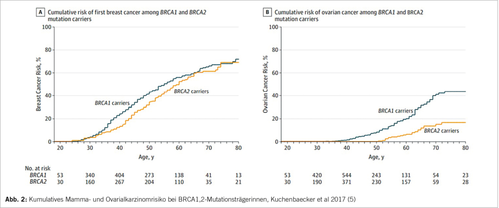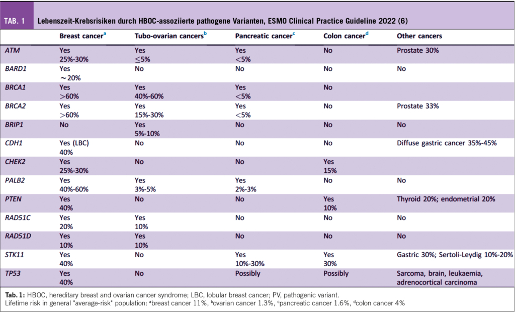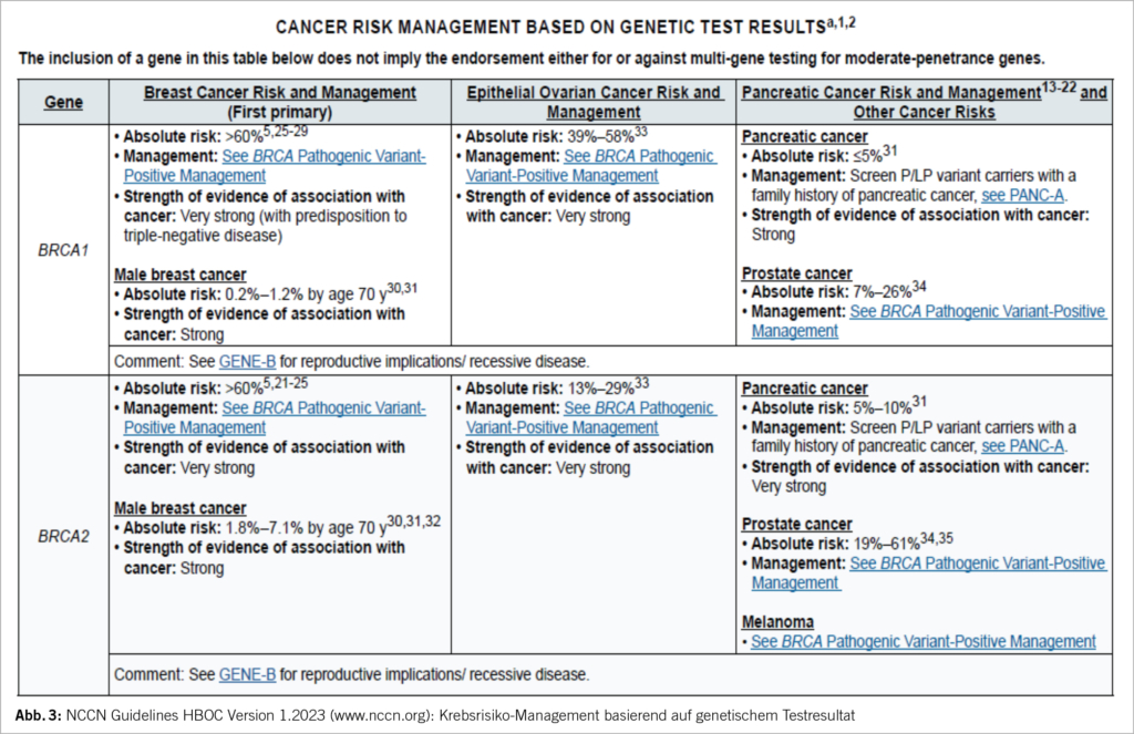 In den Sprechstunden für genetische Beratungen werden Hochrisiko-Patientinnen und deren Familien hinsichtlich erblicher Krebsrisiken informiert (Abb. 1). Hierbei sind die Beratenden oft mit unvollständiger Familienanamnese oder (zunehmend) sehr kleinen Familien konfrontiert (zB weniger als zwei weibliche erst- oder zweitgradig Verwandte > 45 Jahre). Hier besteht das Risiko der Unterschätzung der Wahrscheinlichkeit, dass eine pathogene oder mögliche pathogene Variante (P/LP) vorliegen könnte. Sind viele Familienangehörige gesund geblieben, gibt dies starke Hinweise auf ein niedriges Risiko für eine P/LP Variante. Der nun häufigere Einsatz von Multigen-Tests mittels NGS (next-generation sequencing) hat den klinischen Alltag in den letzten wenigen Jahren verändert. Die CPTC der SAKK hat dies in ihrer praxisnahen Empfehlung zur Zusammensetzung der Gen-Panels festgehalten (www.sakk.ch). Hier werden massgeschneiderte, auf die Krankheit fokussierte Genpanels für klinisch relevante Krebs-Suszeptibilitäts-Gene empfohlen, im Gegensatz zu grossen Multigen-Panels mit unklarer oder unbekannter klinischer Bedeutung. Je breiter das Genpanel gewählt wird, umso höher ist das Risiko auf VUS (variants of unknown significance). In den 9 Genen des BRCA Ovar Panels werden auch sog. intermediär-penetrante Gene (= moderate-risk Gene) bestimmt. Für immer mehr dieser Genvarianten haben wir fundierte Daten zu Krebsrisiken sowie Empfehlungen für ein Risko-Management, z.B. durch die NCCN-Guidelines (www.nccn.org), (Abb. 2).