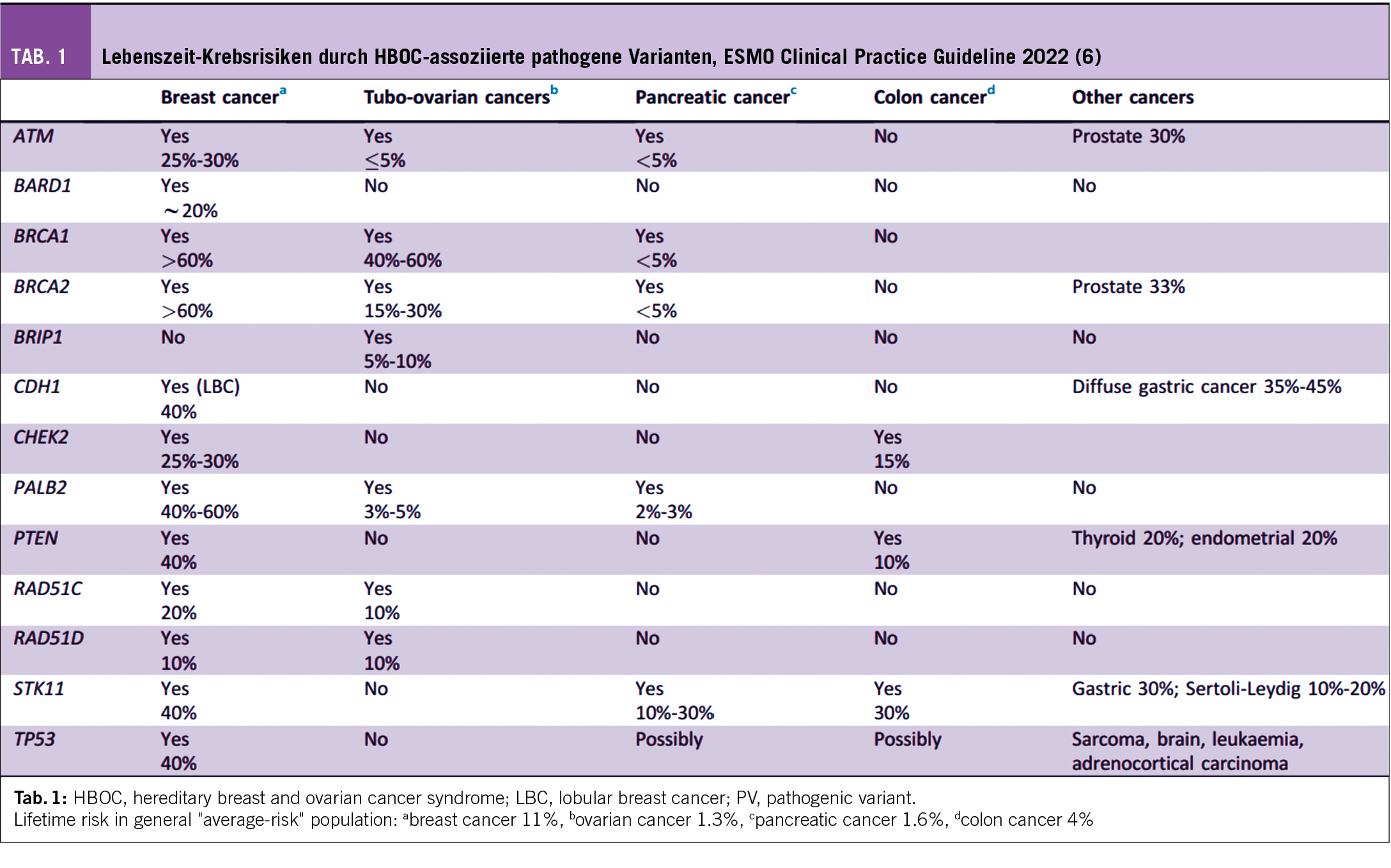 Im Jahr 2021 wurden erstmals in den NCCN guidelines auch die Pankreas- und Prostata-Karzinome zu den HBOC-assoziierten Krankheiten hinzugefügt mit entsprechenden Test-Indikationen und Screening-Empfehlungen (www.nccn.org). Eine Häufung an hereditären Krebsrisiken kann es auch in ethnischen Gruppen mit sogenannten Founder-Varianten geben. Pathogene Varianten werden einerseits als sog. Hochrisiko-Gene (high-risk genes) klassifiziert. Sie erhöhen das Risiko, an einem Mamma- oder Ovarial-Karzinom zu erkranken, um ca. das Vierfache (> 30%), dies sind BRCA1,2, PALB2, PTEN, CDH1, STK11, TP53. Andererseits gibt es sog. moderate-risk Gene wie CHEK2, ATM, BARD1, RAD51C, RAD51D mit Risikoerhöhung um das Zwei-bis Vierfache (3, 4).