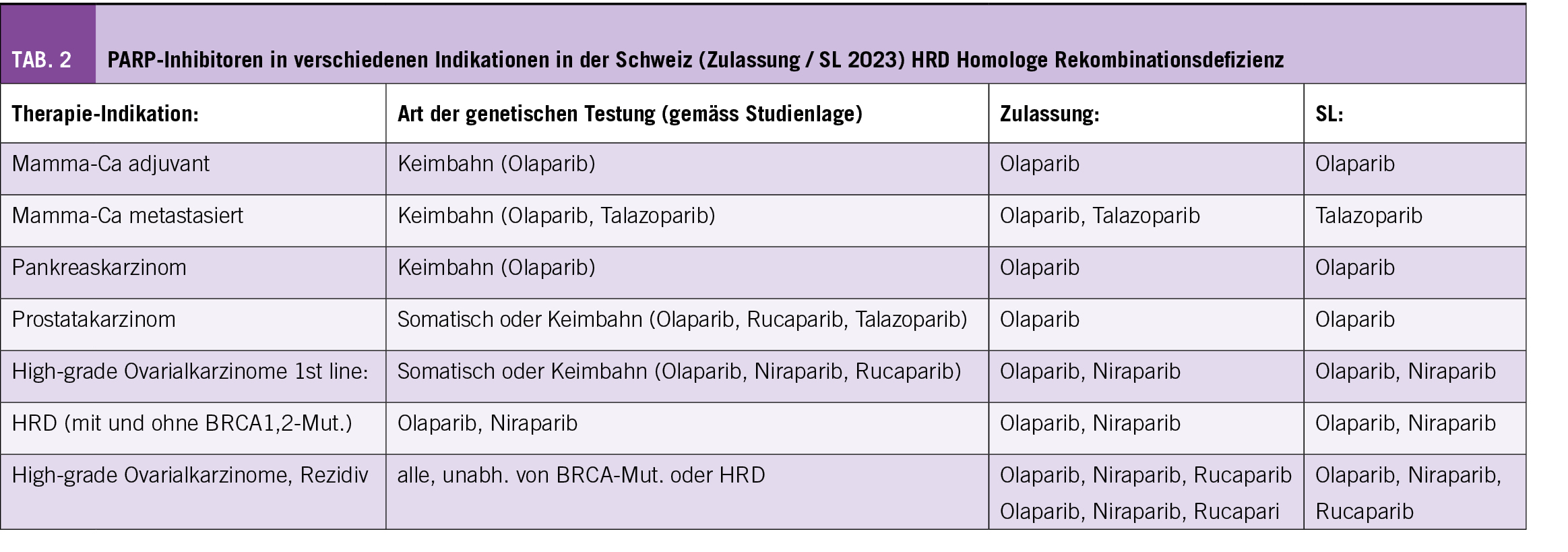 In der Schweiz gibt es ca. 7000 Neuerkrankungen an Prostatakarzinomen; dies ist somit die häufigste Krebsart beim Mann. Bis zu 25% aller Patienten mit einem metastasierten Prostatakarzinom weisen eine somatische oder Keimbahn-DNA-Reparaturgen-Alteration auf. Bereits als Standard werden nun die PARPi in der metastasierten, kastrations-resistenten Situation (mCRPC) angesehen. Mit Olaparib konnte das Gesamtüberleben nach mindestens einer «neuen Hormontherapie» (NHT) bei Männern in der Kohorte mit pathogenen BRCA1,2- sowie ATM-Varianten verbessert werden (PROfound-Studie) (19) und ist in dieser Indikation in der Schweiz zugelassen (Tab. 2). Auch für andere PARPi, wie z.B. Niraparib, gibt es vielversprechende Phase 2-Daten (20). Grundsätzlich profitieren Prostatakarzinom-Patienten mit einer BRCA1,2-Mutation am meisten von PARPi, dies wird im Kommentar der Autoren der European Association of Urology (21) hervorragend herausgearbeitet. Eine klare Übersicht über die neuen Aspekte der Molekulargenetik beim Prostatakarzinom und deren Umsetzung in der Praxis gibt der Artikel von PD Dr. med. Aurelius Omlin et al. im SMF 2022 (22).
