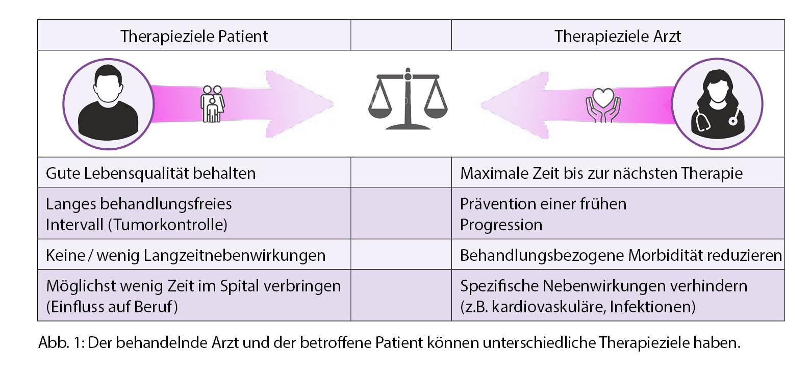 Wie Dr. Canales weiter erläuterte, zeigte eine Arbeit aus Frankreich, dass FL-Patienten, trotz einer Verbesserung im Gesamtüberleben (OS) seit der Einführung von Rituximab, nach wie vor an ihrer Erkrankung sterben und dass Hochrisikopatienten (FLIPI-Score 3 bis 5) eine höhere Lymphom-assoziierte Mortalität aufweisen als Patienten mit einem niedrigen Risiko (FLIPI-Score 0-1) (1). Eine weitere Arbeit ergab, dass das Outcome von Hochrisikopatienten unabhängig davon, welcher Chemotherapie-Partner zusammen mit Rituximab eingesetzt wurde, schlechter war als das von Patienten mit intermediärem oder niedrigem Risiko (2). «Mein Ziel im Management solcher Patienten ist es daher, eine möglichst lange Zeit bis zur nächsten Therapie zu erreichen, eine frühe Progression zu verhindern und die behandlungsbezogene Morbidität möglichst zu minimieren», erklärte Dr. Canales an diesem Punkt der Diskussion (Abb. 1). Für die Patientin sei dagegen nicht nur eine langfristige Tumorkontrolle entscheidend gewesen, sondern auch eine gute Lebensqualität, z.B. durch das Fehlen von Langzeitnebenwirkungen einer Behandlung.